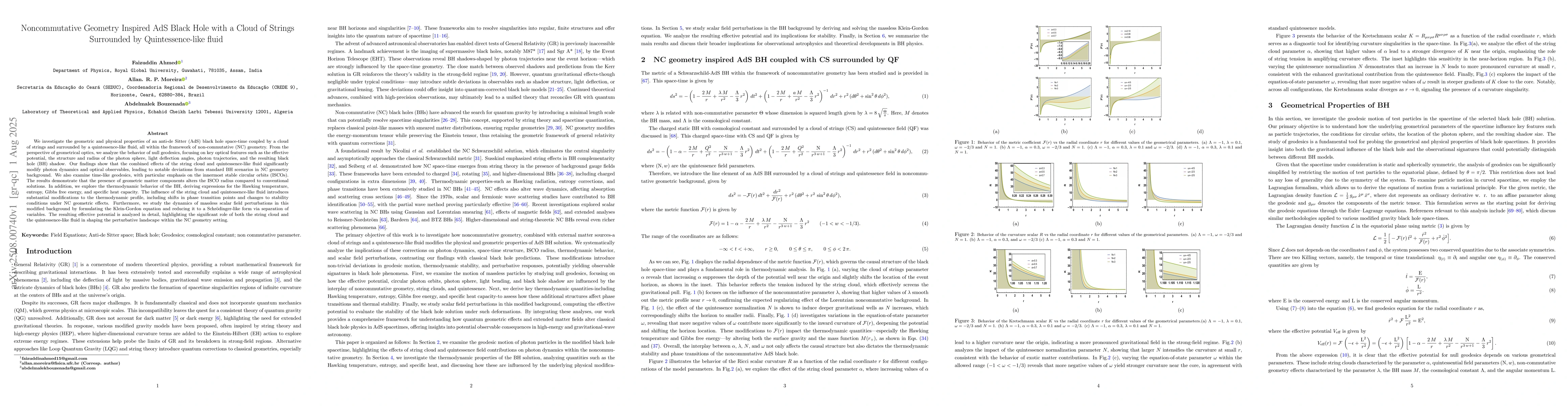 We investigate the geometric and physical properties of an anti-de Sitter (AdS) black hole space-time coupled by a cloud of strings and surrounded by a quintessence-like fluid, all within the framework of non-commutative (NC) geometry. From the perspective of geometrical optics, we analyze the behavior of null geodesics, focusing on key optical features such as the effective potential, the structure and radius of the photon sphere, light deflection angles, photon trajectories, and the resulting black hole (BH) shadow. Our findings show that the combined effects of the string cloud and quintessence-like fluid significantly modify photon dynamics and optical observables, leading to notable deviations from standard BH scenarios in NC geometry background. We also examine time-like geodesics, with particular emphasis on the innermost stable circular orbits (ISCOs). The results demonstrate that the presence of geometric matter components alters the ISCO radius compared to conventional solutions. In addition, we explore the thermodynamic behavior of the BH, deriving expressions for the Hawking temperature, entropy, Gibbs free energy, and specific heat capacity. The influence of the string cloud and quintessence-like fluid introduces substantial modifications to the thermodynamic profile, including shifts in phase transition points and changes to stability conditions under NC geometric effects. Furthermore, we study the dynamics of massless scalar field perturbations in this modified background by formulating the Klein-Gordon equation and reducing it to a Schr\"odinger-like form via separation of variables. The resulting effective potential is analyzed in detail, highlighting the significant role of both the string cloud and the quintessence-like fluid in shaping the perturbative landscape within the NC geometry setting.