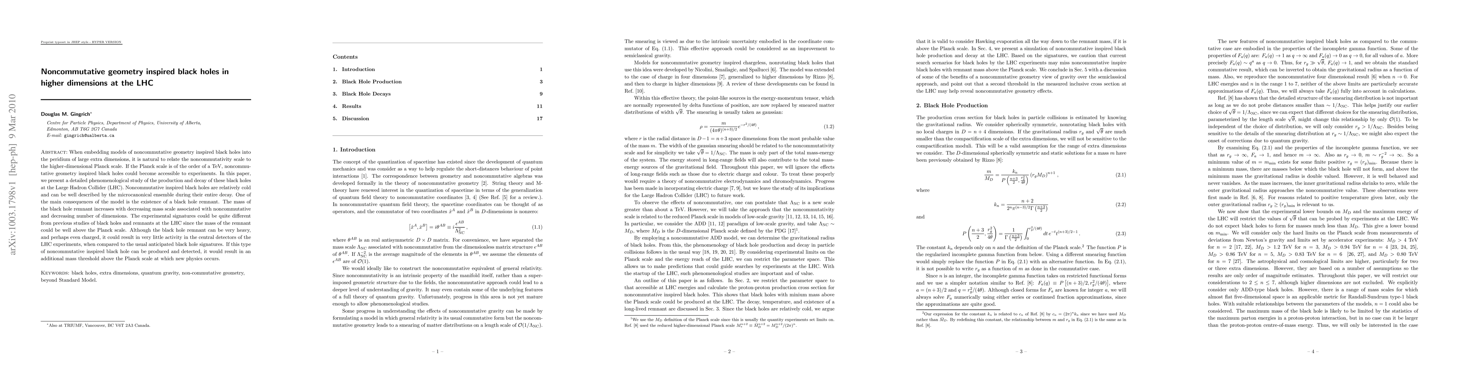 When embedding models of noncommutative geometry inspired black holes into the peridium of large extra dimensions, it is natural to relate the noncommutativity scale to the higher-dimensional Planck scale. If the Planck scale is of the order of a TeV, noncommutative geometry inspired black holes could become accessible to experiments. In this paper, we present a detailed phenomenological study of the production and decay of these black holes at the Large Hadron Collider (LHC). Noncommutative inspired black holes are relatively cold and can be well described by the microcanonical ensemble during their entire decay. One of the main consequences of the model is the existence of a black hole remnant. The mass of the black hole remnant increases with decreasing mass scale associated with noncommutative and decreasing number of dimensions. The experimental signatures could be quite different from previous studies of black holes and remnants at the LHC since the mass of the remnant could be well above the Planck scale. Although the black hole remnant can be very heavy, and perhaps even charged, it could result in very little activity in the central detectors of the LHC experiments, when compared to the usual anticipated black hole signatures. If this type of noncommutative inspired black hole can be produced and detected, it would result in an additional mass threshold above the Planck scale at which new physics occurs.