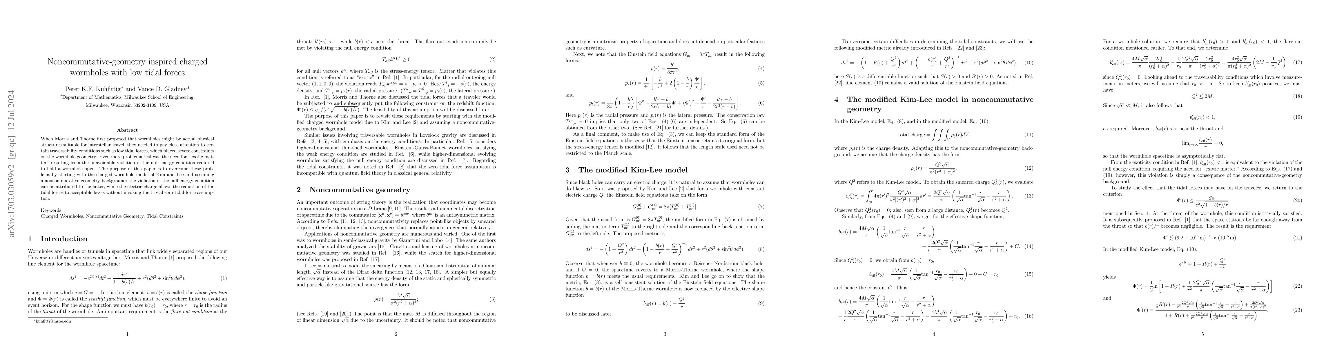 This paper proposes a charged wormhole model inspired by noncommutative geometry to address the challenges of traversability, including low tidal forces and the need for exotic matter. By leveraging electric charge and noncommutative geometry, it aims to reduce tidal forces while avoiding the null energy condition violation.