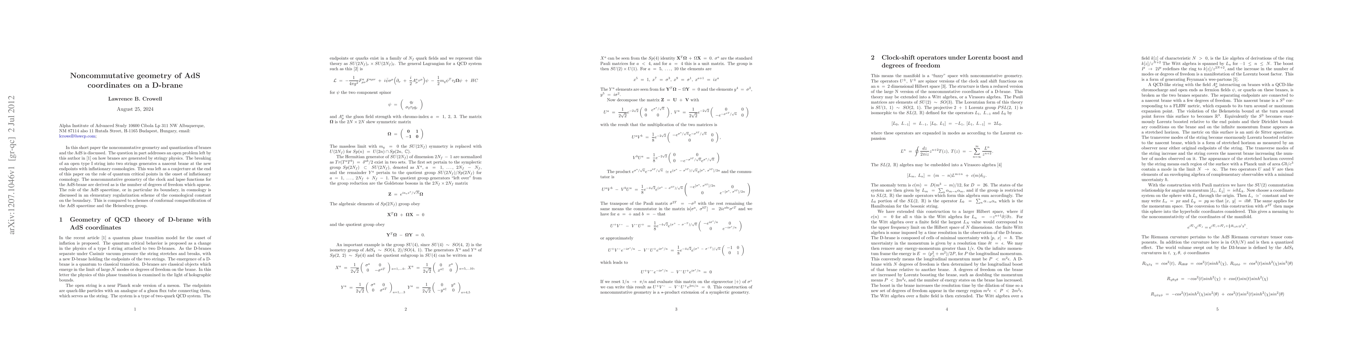 This paper explores the noncommutative geometry of Anti-de Sitter (AdS) coordinates on a D-brane, addressing how branes are generated through stringy physics and the role of quantum critical points in inflationary cosmology. It derives the noncommutative geometry of clock and lapse functions for AdS-branes and discusses the cosmological implications of AdS spacetime, comparing different regularization schemes.