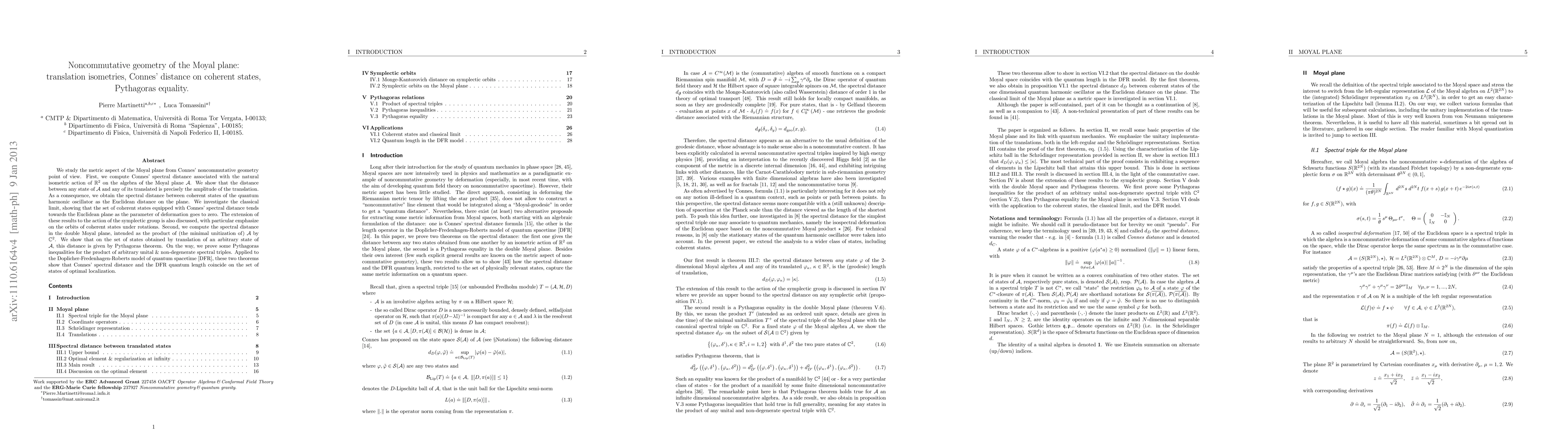We study the metric aspect of the Moyal plane from Connes' noncommutative geometry point of view. First, we compute Connes' spectral distance associated with the natural isometric action of R^2 on the algebra of the Moyal plane A. We show that the distance between any state of A and any of its translated is precisely the amplitude of the translation. As a consequence, we obtain the spectral distance between coherent states of the quantum harmonic oscillator as the Euclidean distance on the plane. We investigate the classical limit, showing that the set of coherent states equipped with Connes' spectral distance tends towards the Euclidean plane as the parameter of deformation goes to zero. The extension of these results to the action of the symplectic group is also discussed, with particular emphasize on the orbits of coherent states under rotations. Second, we compute the spectral distance in the double Moyal plane, intended as the product of (the minimal unitization of) A by C^2. We show that on the set of states obtained by translation of an arbitrary state of A, this distance is given by Pythagoras theorem. On the way, we prove some Pythagoras inequalities for the product of arbitrary unital & non-degenerate spectral triples. Applied to the Doplicher-Fredenhagen-Roberts model of quantum spacetime [DFR], these two theorems show that Connes' spectral distance and the DFR quantum length coincide on the set of states of optimal localization. Some of the results of this paper can be thought as a continuation of arXiv:0912.0906, as well as a companion to arXiv:1106.0261.