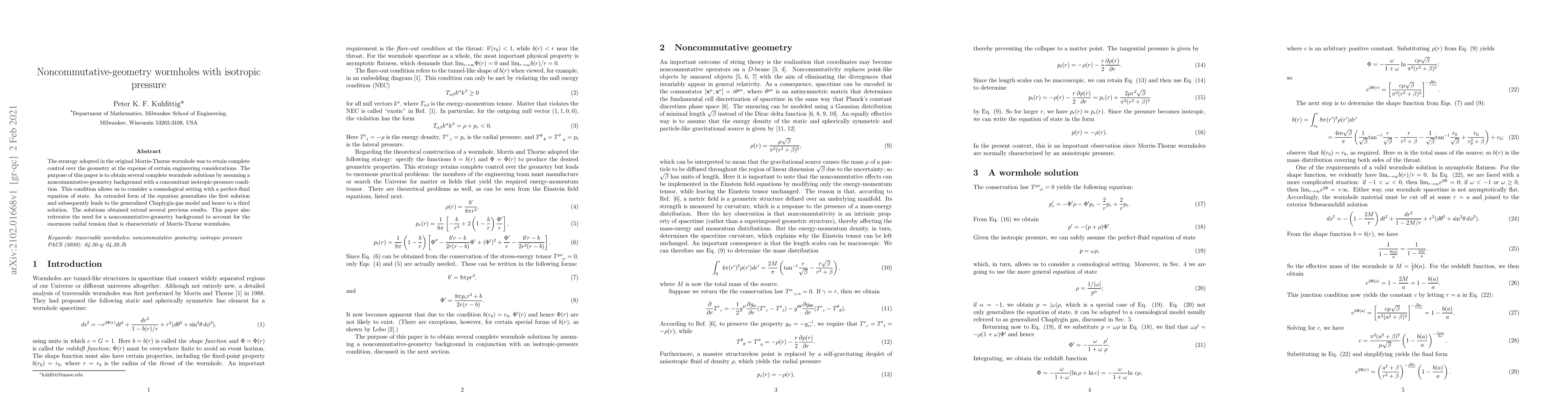 Researchers developed new wormhole solutions using noncommutative-geometry backgrounds with isotropic pressure, extending previous results and addressing the need for radial tension in Morris-Thorne wormholes.