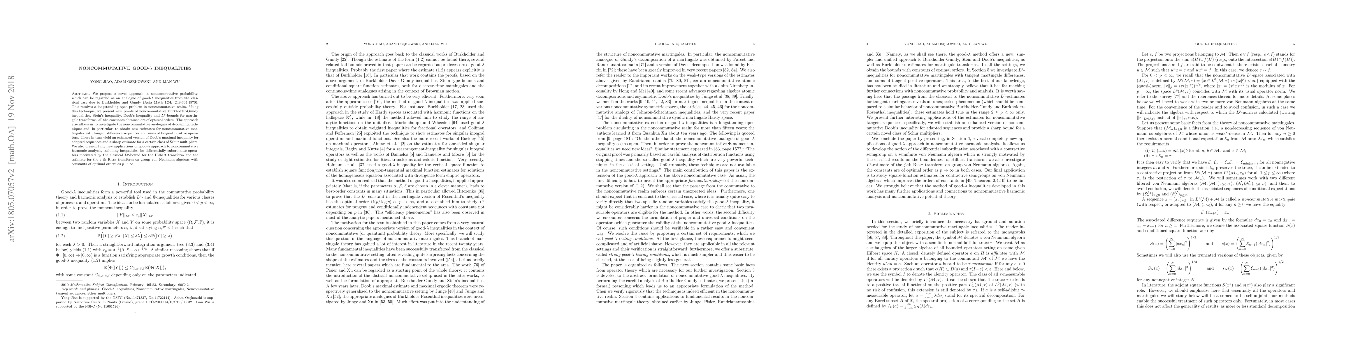 We propose a novel approach in noncommutative probability, which can be regarded as an analogue of good-$\lambda$ inequalities from the classical case due to Burkholder and Gundy (Acta Math {\bf124}: 249-304,1970). This resolves a longstanding open problem in noncommutative realm. Using this technique, we present new proofs of noncommutative Burkholder-Gundy inequalities, Stein's inequality, Doob's inequality and $L^p$-bounds for martingale transforms; all the constants obtained are of optimal orders. The approach also allows us to investigate the noncommutative analogues of decoupling techniques and, in particular, to obtain new estimates for noncommutative martingales with tangent difference sequences and sums of tangent positive operators. These in turn yield an enhanced version of Doob's maximal inequality for adapted sequences and a sharp estimate for a certain class of Schur multipliers. We also present fully new applications of good-$\lambda$ approach to noncommutative harmonic analysis, including inequalities for differentially subordinate operators motivated by the classical $L^p$-bound for the Hilbert transform and the estimate for the $j$-th Riesz transform on group von Neumann algebras with constants of optimal orders as $p\to\infty.$