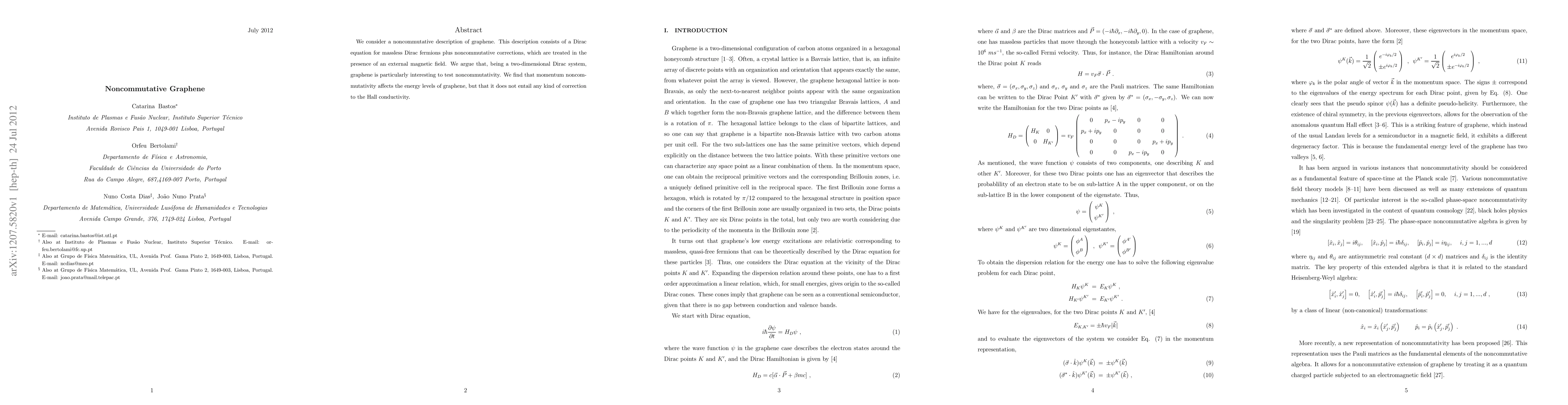 We consider a noncommutative description of graphene. This description consists of a Dirac equation for massless Dirac fermions plus noncommutative corrections, which are treated in the presence of an external magnetic field. We argue that, being a two-dimensional Dirac system, graphene is particularly interesting to test noncommutativity. We find that momentum noncommutativity affects the energy levels of graphene, but that it does not entail any kind of correction to the Hall conductivity.