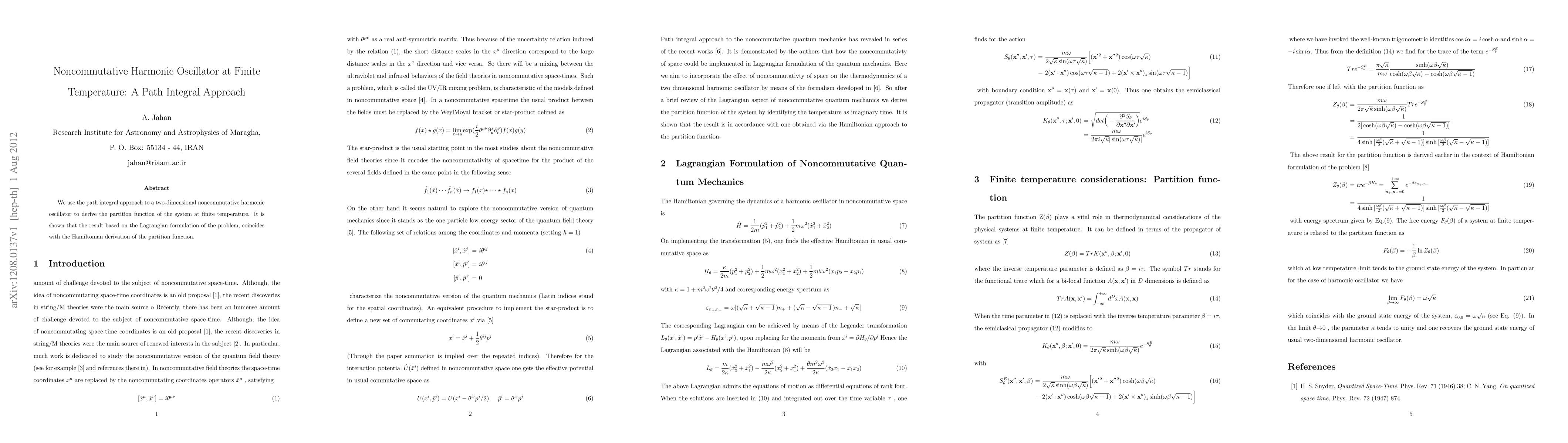 Summary: This research employs the path integral method to derive the finite temperature partition function for a two-dimensional noncommutative harmonic oscillator. The results from the Lagrangian and Hamiltonian formulations are shown to be consistent.