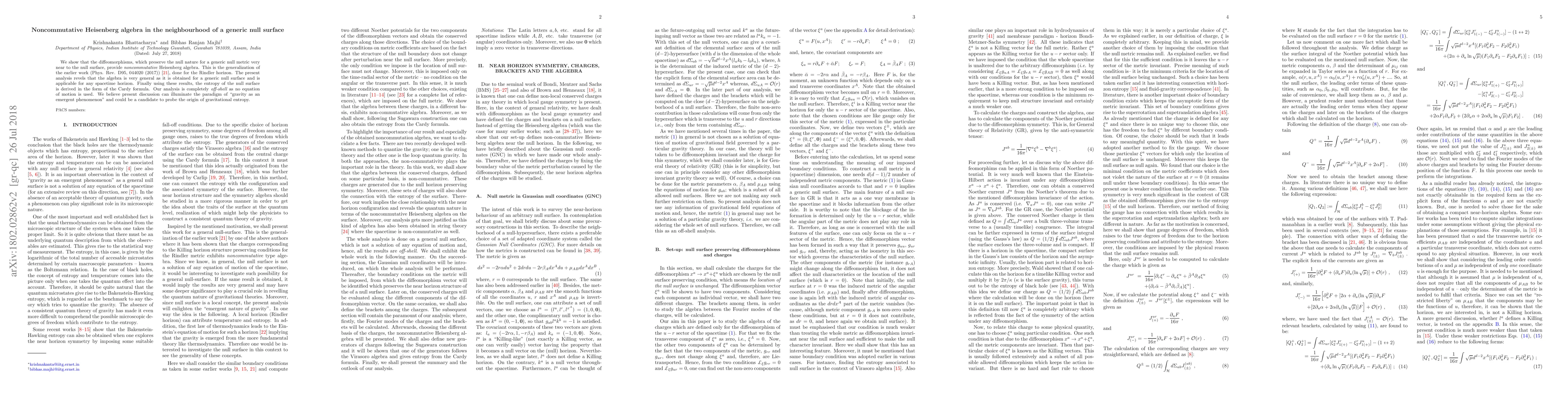 We show that the diffeomorphisms, which preserve the null nature for a generic null metric very near to the null surface, provide {\it noncommutative} Heisenberg algebra. This is the generalization of the earlier work (Phys. Rev. D95, 044020 (2017)) \cite{Majhi:2017fua}, done for the Rindler horizon. The present analysis revels that the algebra is very general as it is obtained for a generic null surface and is applicable for any spacetime horizon. Finally using these results, the entropy of the null surface is derived in the form of the Cardy formula. Our analysis is completely {\it off-shell} as no equation of motion is used. We believe present discussion can illuminate the paradigm of `gravity as an emergent phenomenon' and could be a candidate to probe the origin of gravitational entropy.