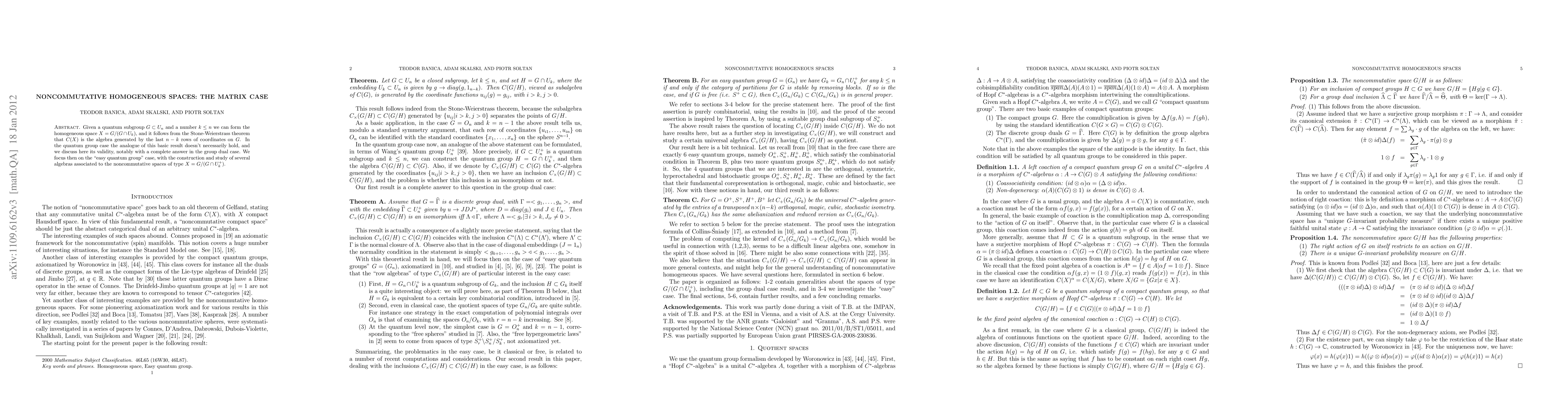 Given a quantum subgroup $G\subset U_n$ and a number $k\leq n$ we can form the homogeneous space $X=G/(G\cap U_k)$, and it follows from the Stone-Weierstrass theorem that $C(X)$ is the algebra generated by the last $n-k$ rows of coordinates on $G$. In the quantum group case the analogue of this basic result doesn't necessarily hold, and we discuss here its validity, notably with a complete answer in the group dual case. We focus then on the "easy quantum group" case, with the construction and study of several algebras associated to the noncommutative spaces of type $X=G/(G\cap U_k^+)$.