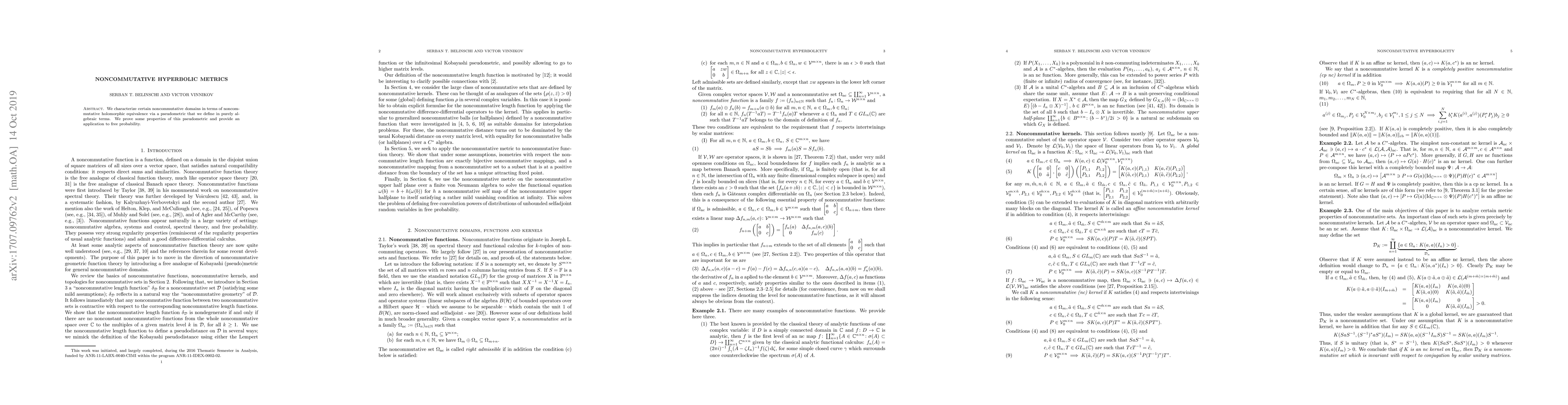 We characterize certain noncommutative domains in terms of noncommutative holomorphic equivalence via a pseudometric that we define in purely algebraic terms. We prove some properties of this pseudometric and provide an application to free probability.