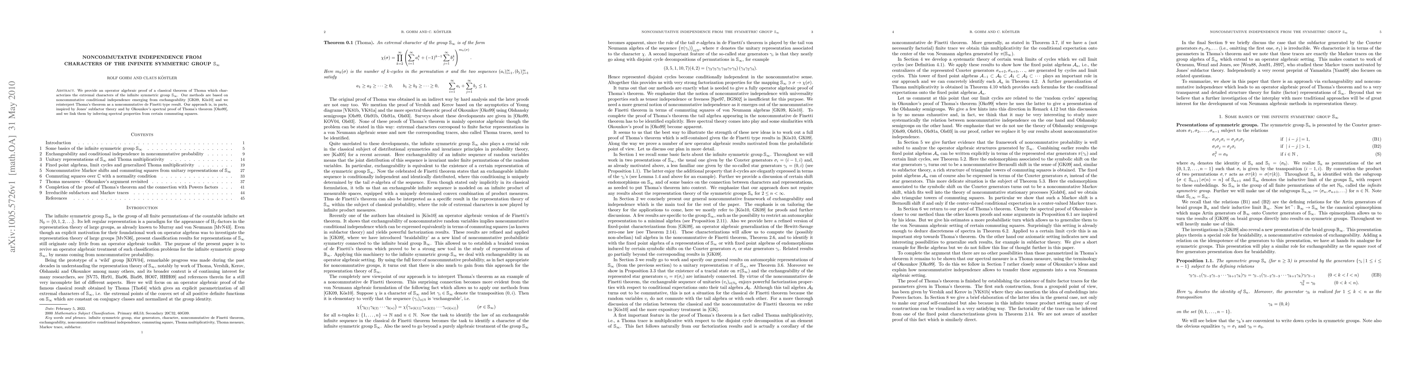 This paper provides an operator algebraic proof of Thoma's theorem on extremal characters of the infinite symmetric group $\mathbb{S}_\infty$, using noncommutative conditional independence and linking it to a noncommutative de Finetti result. The approach draws on Jones' subfactor theory and Okounkov's spectral proof, inferring spectral properties from commuting squares.