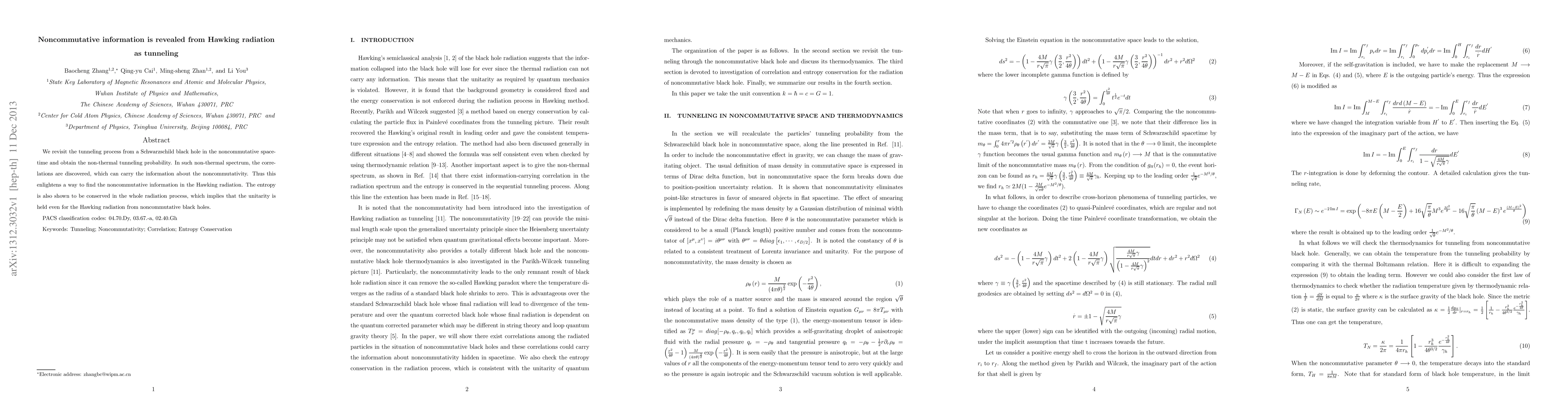 Summary: This study revisits the tunneling process from a Schwarzschild black hole in noncommutative spacetime, revealing a non-thermal Hawking radiation spectrum that carries noncommutative information. The findings suggest that entropy conservation implies unitarity is maintained in this context.