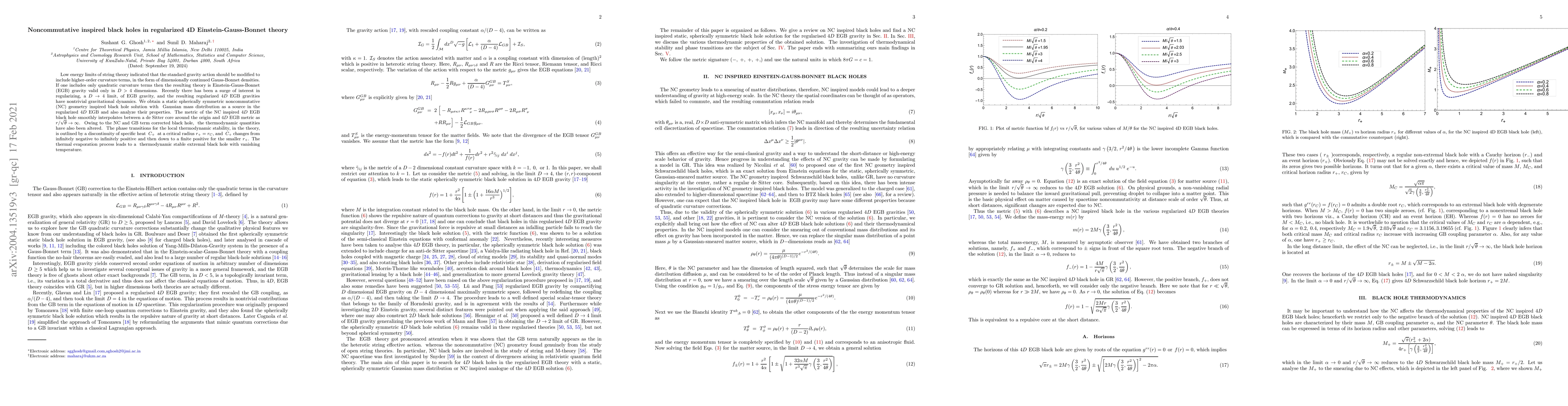 Low energy limits of string theory indicated that the standard gravity action should be modified to include higher-order curvature terms, in the form of dimensionally continued Gauss-Bonnet densities. If one includes only quadratic curvature terms then the resulting theory is Einstein-Gauss-Bonnet (EGB) gravity valid only in $D>4$ dimensions. Recently there has been a surge of interest in regularizing, a $ D \to 4 $ limit, of EGB gravity, and the resulting regularized $4D$ EGB gravities have nontrivial gravitational dynamics. We obtain a static spherically symmetric noncommutative (NC) geometry inspired black hole solution with Gaussian mass distribution as a source in the regularized $4D$ EGB and also analyze their properties. The metric of the NC inspired $4D$ EGB black hole smoothly interpolates between a de Sitter core around the origin and $4D$ EGB metric as $r/\sqrt{\theta} \to \infty$. Owing to the NC and GB term corrected black hole, the thermodynamic quantities have also been altered. The phase transitions for the local thermodynamic stability, in the theory, is outlined by a discontinuity of specific heat $C_{+}$ at a critical radius $r_+=r_C$, and $C_{+}$ changes from infinitely negative to infinitely positive and then down to a finite positive for the smaller $r_+$. The thermal evaporation process leads to a thermodynamic stable extremal black hole with vanishing temperature.