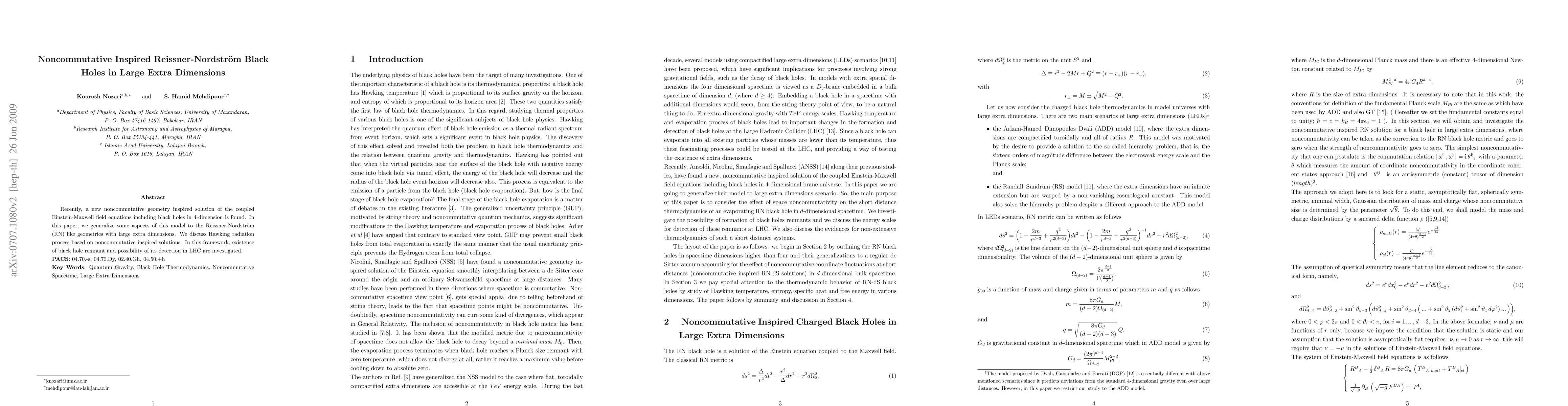 This paper generalizes noncommutative geometry-inspired solutions to Reissner-Nordström black holes in the context of large extra dimensions, exploring Hawking radiation and the potential for black hole remnant detection at the LHC.
