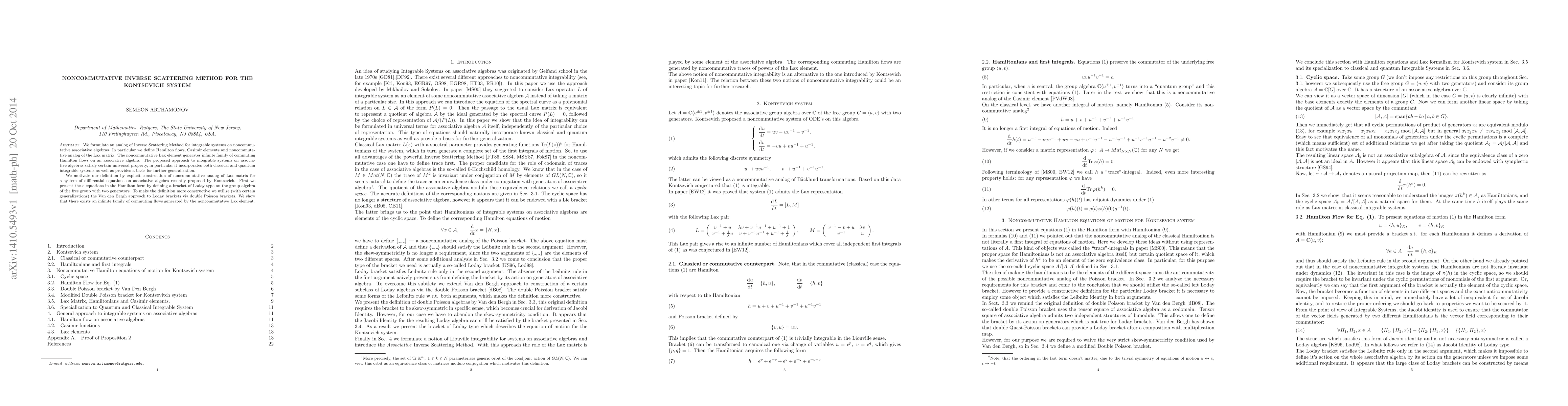 We formulate an analog of Inverse Scattering Method for integrable systems on noncommutative associative algebras. In particular we define Hamilton flows, Casimir elements and noncommutative analog of the Lax matrix. The noncommutative Lax element generates infinite family of commuting Hamilton flows on an associative algebra. The proposed approach to integrable systems on associative algebras satisfy certain universal property, in particular it incorporates both classical and quantum integrable systems as well as provides a basis for further generalization. We motivate our definition by explicit construction of noncommutative analog of Lax matrix for a system of differential equations on associative algebra recently proposed by Kontsevich. First we present these equations in the Hamilton form by defining a bracket of Loday type on the group algebra of the free group with two generators. To make the definition more constructive we utilize (with certain generalizations) the Van den Bergh approach to Loday brackets via double Poisson brackets. We show that there exists an infinite family of commuting flows generated by the noncommutative Lax element.
