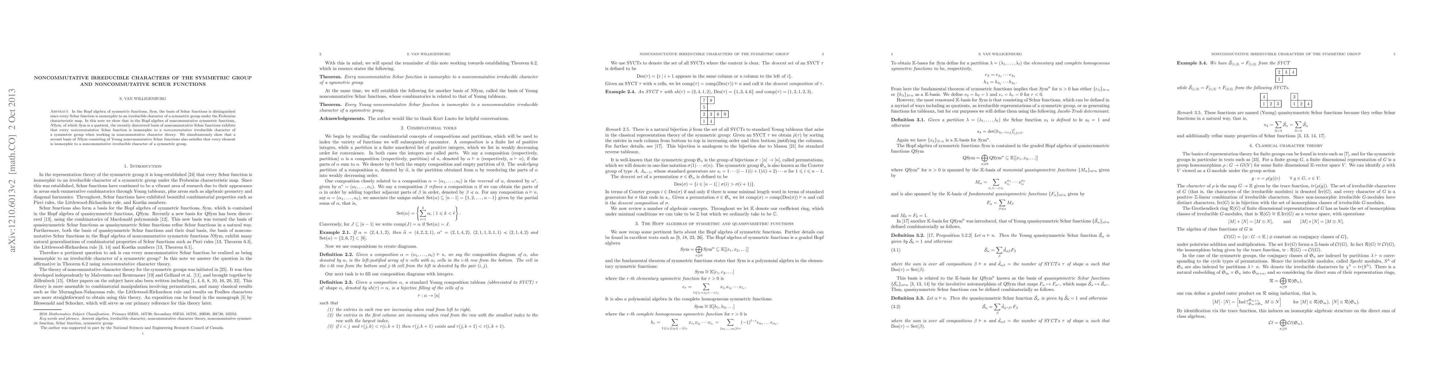 This paper explores the relationship between noncommutative symmetric functions and noncommutative irreducible characters in the symmetric group, demonstrating that both the recently discovered noncommutative Schur functions and the Young noncommutative Schur functions correspond to noncommutative irreducible characters.