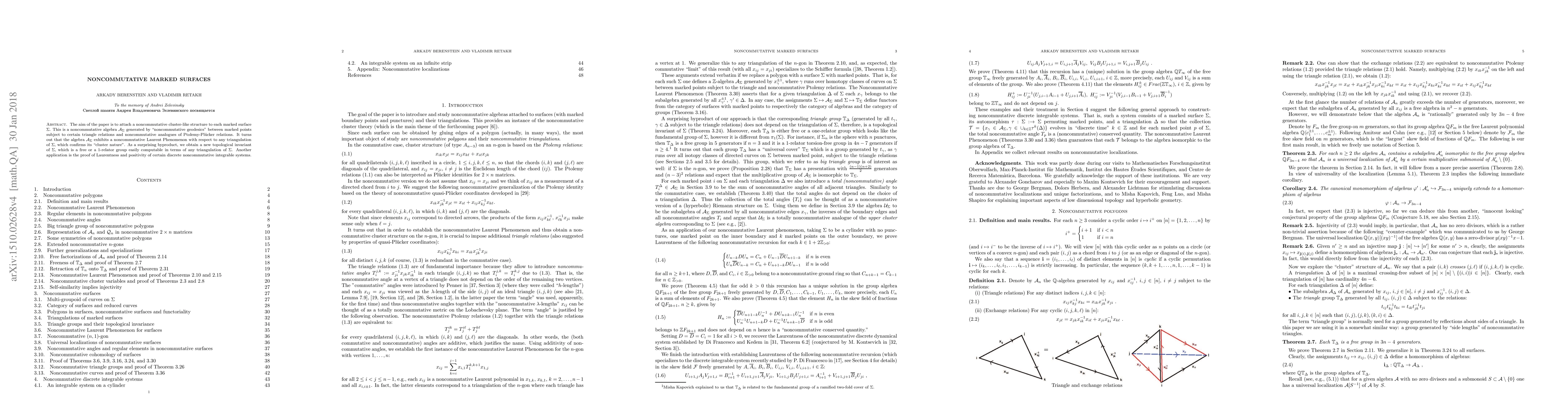 The aim of the paper is to attach a noncommutative cluster-like structure to each marked surface $\Sigma$. This is a noncommutative algebra ${\mathcal A}_\Sigma$ generated by "noncommutative geodesics" between marked points subject to certain triangle relations and noncommutative analogues of Ptolemy-Pl\"ucker relations. It turns out that the algebra ${\mathcal A}_\Sigma$ exhibits a noncommutative Laurent Phenomenon with respect to any triangulation of $\Sigma$, which confirms its "cluster nature". As a surprising byproduct, we obtain a new topological invariant of $\Sigma$, which is a free or a 1-relator group easily computable in terms of any triangulation of $\Sigma$. Another application is the proof of Laurentness and positivity of certain discrete noncommutative integrable systems.