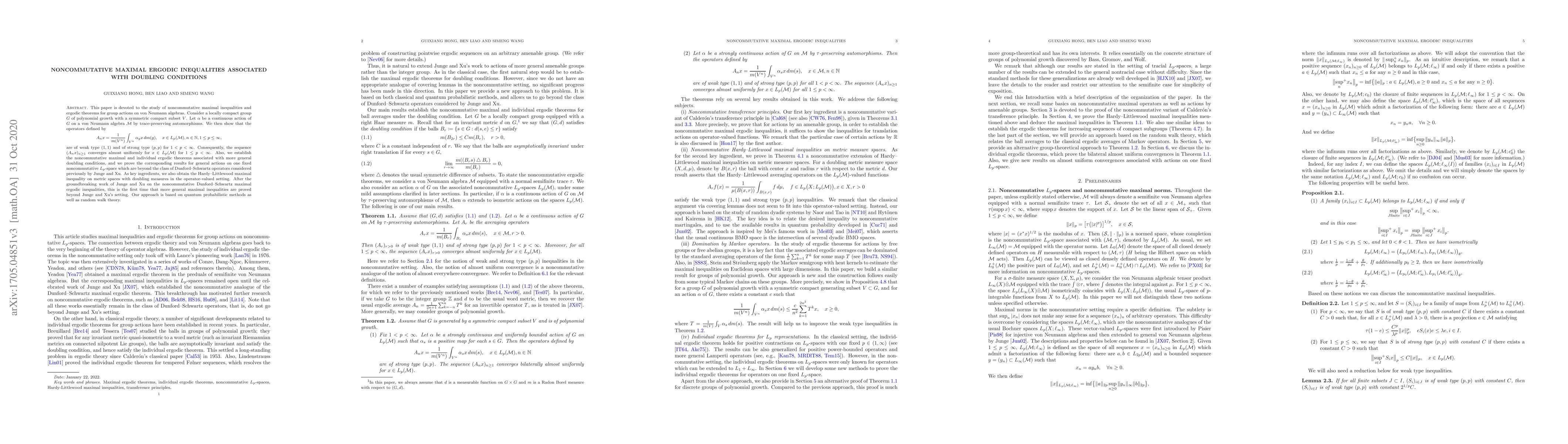 This paper establishes noncommutative maximal ergodic inequalities for group actions on von Neumann algebras under doubling conditions, proving weak and strong types for operators defined by repeated integrals of trace-preserving automorphisms. It extends beyond previous results to general actions and employs quantum probabilistic methods and random walk theory.
