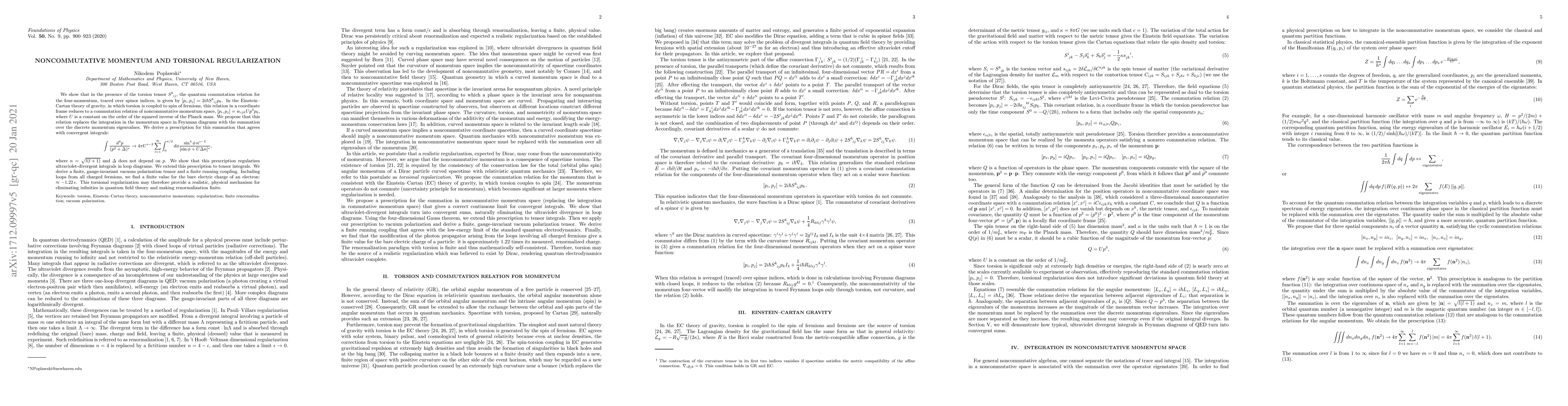 We show that in the presence of the torsion tensor $S^k_{\phantom{k}ij}$, the quantum commutation relation for the four-momentum, traced over spinor indices, is given by $[p_i,p_j]=2i\hbar S^k_{\phantom{k}ij}p_k$. In the Einstein--Cartan theory of gravity, in which torsion is coupled to spin of fermions, this relation in a coordinate frame reduces to a commutation relation of noncommutative momentum space, $[p_i,p_j]=i\epsilon_{ijk}Up^3 p_k$, where $U$ is a constant on the order of the squared inverse of the Planck mass. We propose that this relation replaces the integration in the momentum space in Feynman diagrams with the summation over the discrete momentum eigenvalues. We derive a prescription for this summation that agrees with convergent integrals: \[ \int\frac{d^4p}{(p^2+\Delta)^s}\rightarrow 4\pi U^{s-2}\sum_{l=1}^\infty \int_0^{\pi/2} d\phi \frac{\sin^4\phi\,n^{s-3}}{[\sin\phi+U\Delta n]^s}, \] where $n=\sqrt{l(l+1)}$ and $\Delta$ does not depend on $p$. We show that this prescription regularizes ultraviolet-divergent integrals in loop diagrams. We extend this prescription to tensor integrals. We derive a finite, gauge-invariant vacuum polarization tensor and a finite running coupling. Including loops from all charged fermions, we find a finite value for the bare electric charge of an electron: $\approx -1.22\,e$. This torsional regularization may therefore provide a realistic, physical mechanism for eliminating infinities in quantum field theory and making renormalization finite.