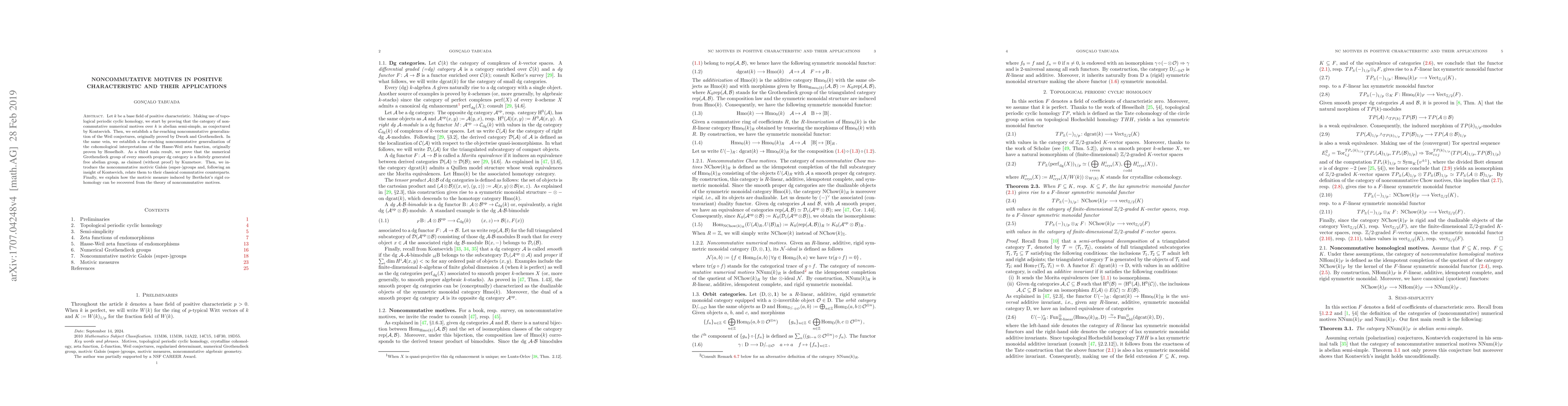 Let k be a base field of positive characteristic. Making use of topological periodic cyclic homology, we start by proving that the category of noncommutative numerical motives over k is abelian semi-simple, as conjectured by Kontsevich. Then, we establish a far-reaching noncommutative generalization of the Weil conjectures, originally proved by Dwork and Grothendieck. In the same vein, we establish a far-reaching noncommutative generalization of the cohomological interpretations of the Hasse-Weil zeta function, originally proven by Hesselholt. As a third main result, we prove that the numerical Grothendieck group of every smooth proper dg category is a finitely generated free abelian group, as claimed (without proof) by Kuznetsov. Then, we introduce the noncommutative motivic Galois (super-)groups and, following an insight of Kontsevich, relate them to their classical commutative counterparts. Finally, we explain how the motivic measure induced by Berthelot's rigid cohomology can be recovered from the theory of noncommutative motives.