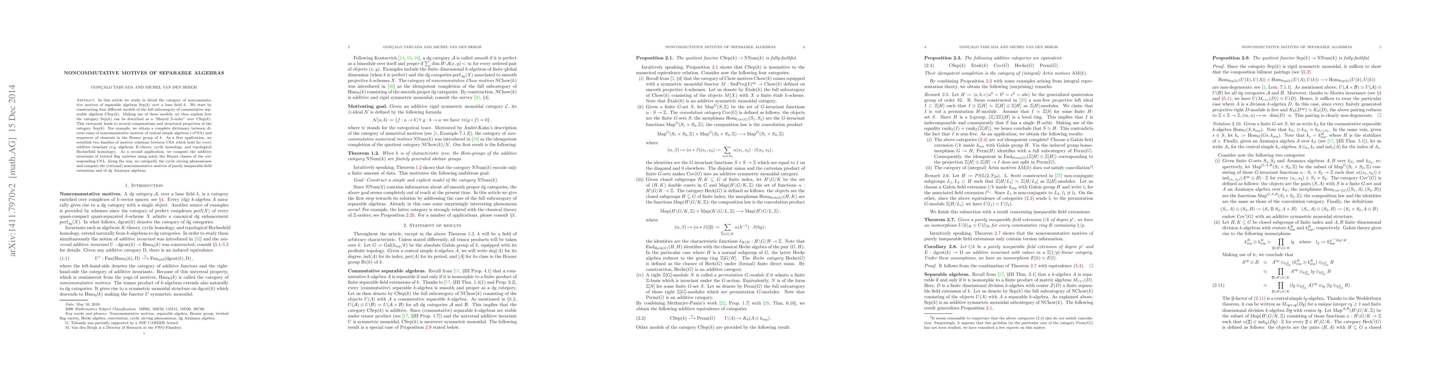 This paper explores the category of noncommutative motives of separable algebras over a base field, constructs four models for commutative separable algebras, and shows Sep(k) can be described as a "fibered Z-order" over CSep(k). It provides a dictionary between noncommutative motives and Brauer group elements and applies these findings to compute motivic relations and invariants of twisted flag varieties.