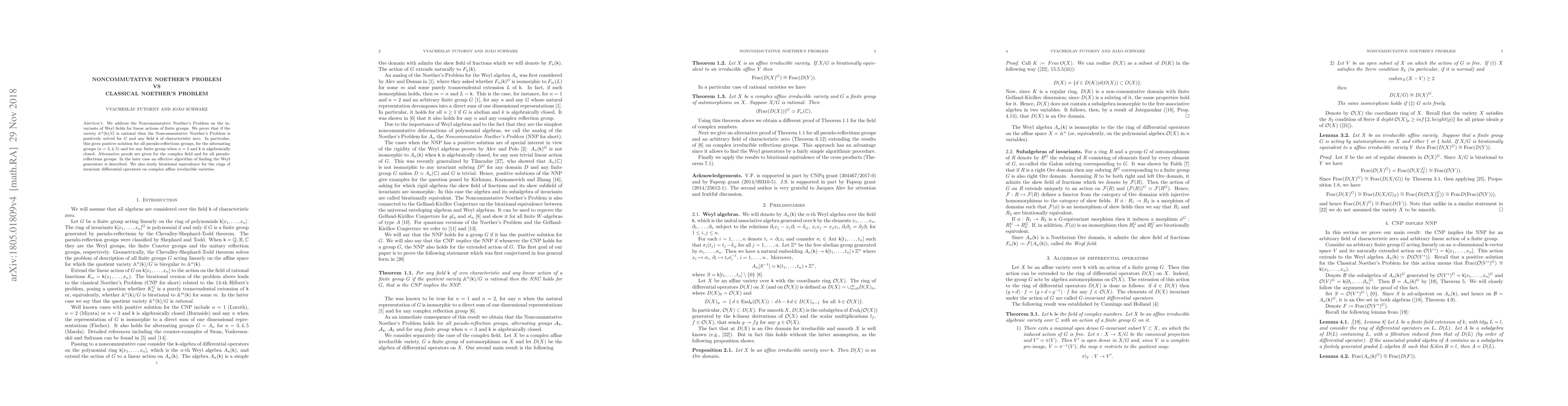 We address the Noncommutative Noether's Problem on the invariants of Weyl fields for linear actions of finite groups. We prove that if the variety An(k)/G is rational then the Noncommutative Noether's Problem is positively solved for G and any field k of characteristic zero. In particular, this gives positive solution for all pseudo-reflections groups, for the alternating groups (n = 3,4,5) and for any finite group when n = 3. Alternative proofs are given for the complex field and for all pseudo-reflections groups. In the later case an effective algorithm of finding the Weyl generators is described. We also study birational equivalence for the rings of invariant differential operators on complex affine irreducible varieties.