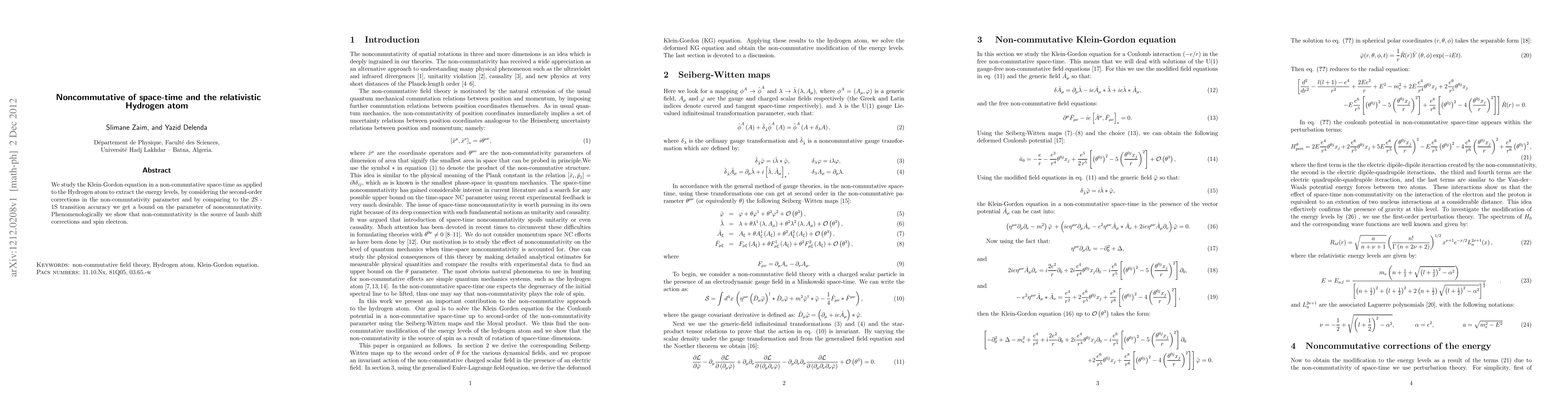 This paper investigates the Klein-Gordon equation in non-commutative space-time applied to the Hydrogen atom, extracting energy levels with second-order corrections in non-commutativity parameters. It demonstrates that non-commutativity provides a source for Lamb shift corrections and electron spin effects.