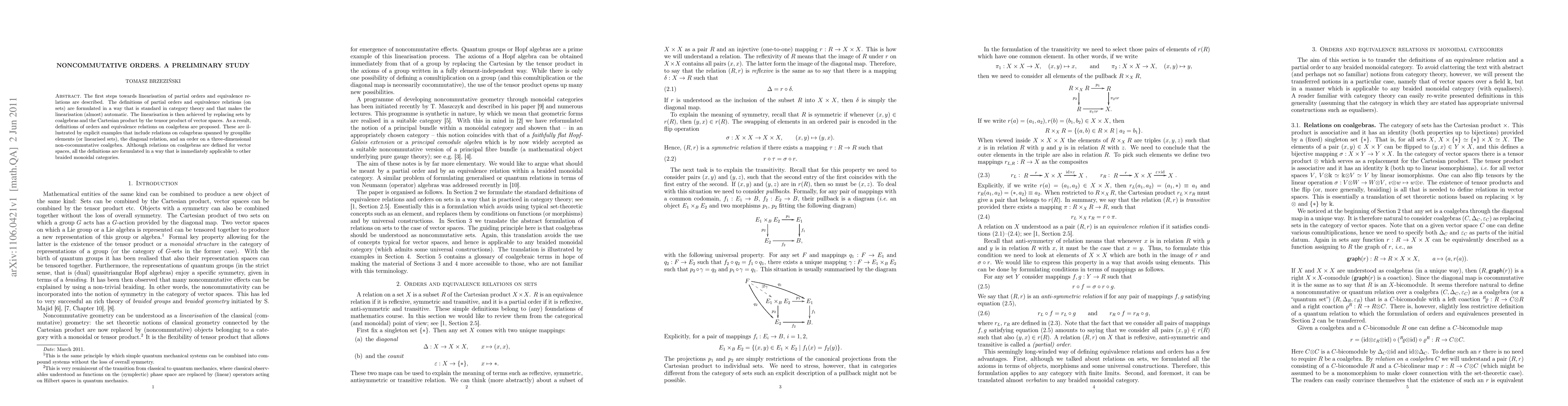 The first steps towards linearisation of partial orders and equivalence relations are described. The definitions of partial orders and equivalence relations (on sets) are formulated in a way that is standard in category theory and that makes the linearisation (almost) automatic. The linearisation is then achieved by replacing sets by coalgebras and the Cartesian product by the tensor product of vector spaces. As a result, definitions of orders and equivalence relations on coalgebras are proposed. These are illustrated by explicit examples that include relations on colagebras spanned by grouplike elements (or linearised sets), the diagonal relation, and an order on a three-dimensional non-cocommutative coalgebra. Although relations on coalgebras are defined for vector spaces, all the definitions are formulated in a way that is immediately applicable to other braided monoidal categories.