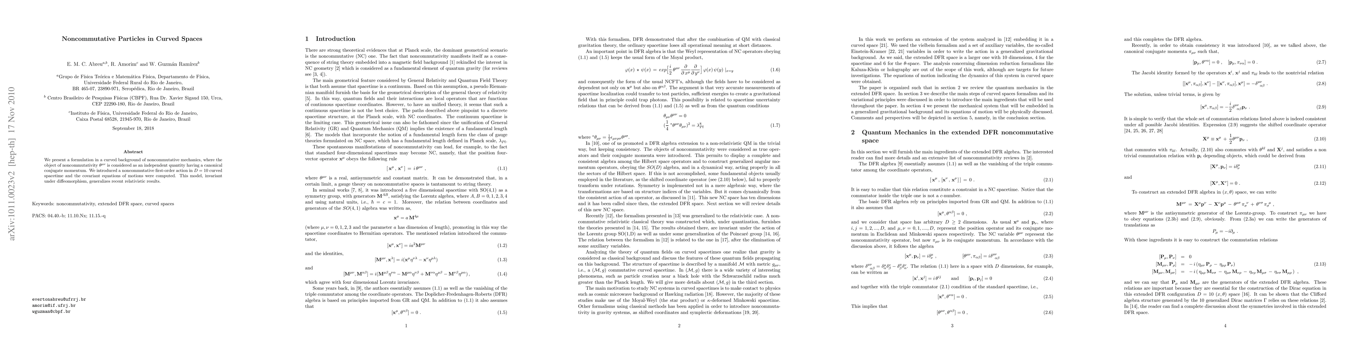 This paper formulates noncommutative mechanics in a curved D=10 spacetime, introducing a noncommutative first-order action and covariant equations of motion, which generalizes recent relativistic results and maintains invariance under diffeomorphism.
