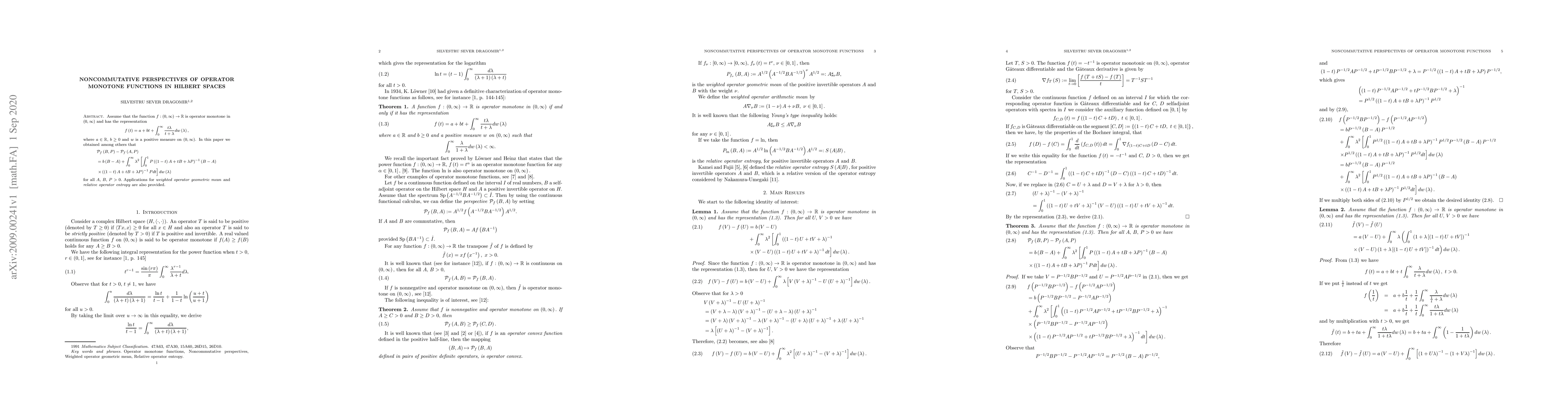 Summary: This paper explores identities for noncommutative operator monotone functions in Hilbert spaces and provides applications to the weighted operator geometric mean and relative operator entropy. The study advances understanding of noncommutative function theory in operator algebras.