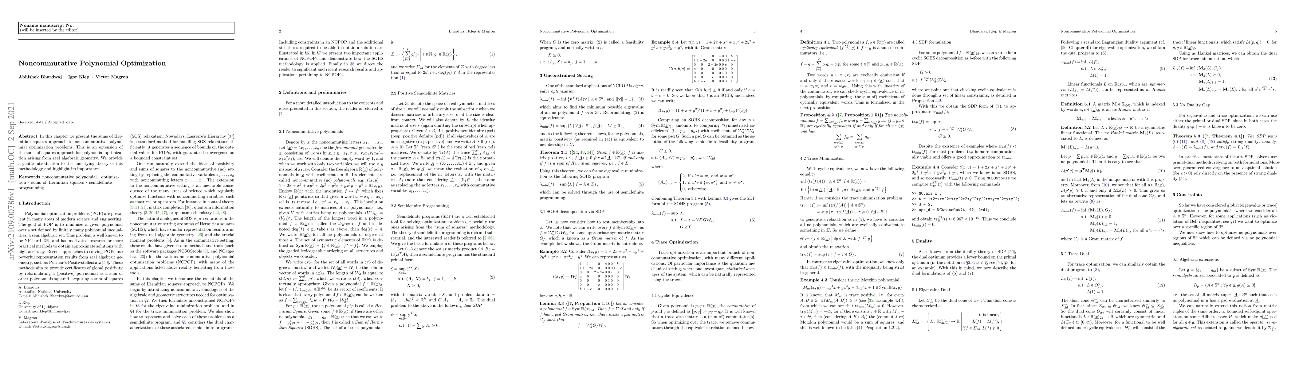 This paper introduces the sums of Hermitian squares approach for noncommutative polynomial optimization, extending the sums of squares method from real algebraic geometry. It provides a foundational overview of the methodology and underscores its significance in the field.