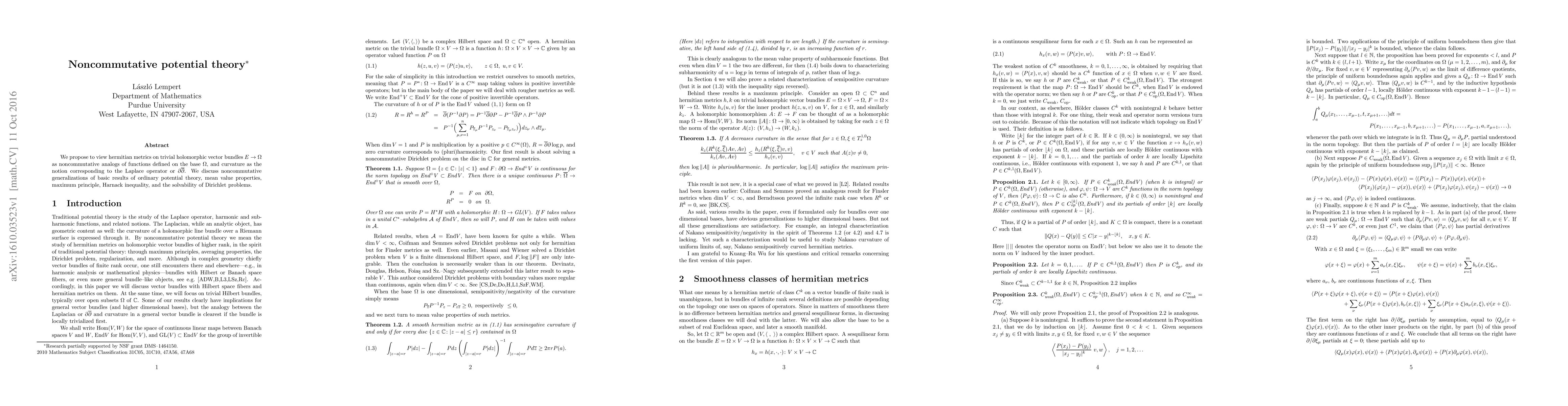We propose to view hermitian metrics on trivial holomorphic vector bundles $E\to\Omega$ as noncommutative analogs of functions defined on the base $\Omega$, and curvature as the notion corresponding to the Laplace operator or $\partial\overline\partial$. We discuss noncommutative generalizations of basic results of ordinary potential theory, mean value properties, maximum principle, Harnack inequality, and the solvability of Dirichlet problems.