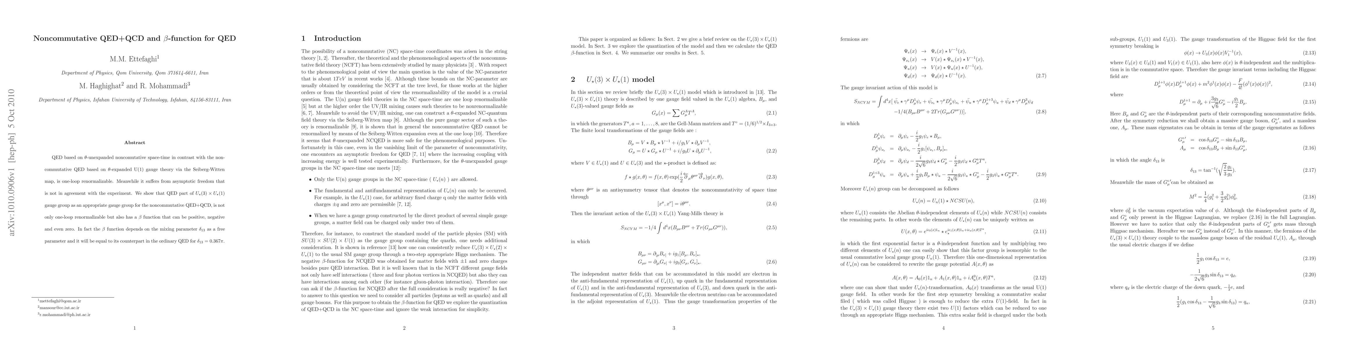 This paper explores noncommutative QED+QCD in $\theta$-unexpanded noncommutative space-time, demonstrating one-loop renormalizability and the potential for a $\beta$ function that varies with the mixing parameter $\delta_{13}$. The $\beta$ function can be positive, negative, or zero, aligning with ordinary QED when $\delta_{13}=0.367\pi$.