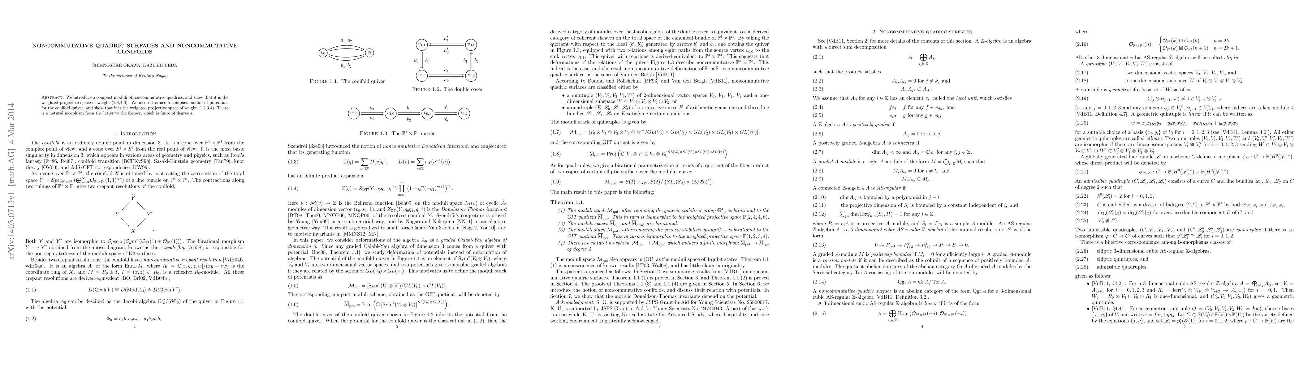 We introduce a compact moduli of noncommutative quadrics, and show that it is the weighted projective space of weight (2,4,4,6). We also introduce a compact moduli of potentials for the conifold quiver, and show that it is the weighted projective space of weight (1,2,3,4). There is a natural morphism from the latter to the former, which is finite of degree 4.