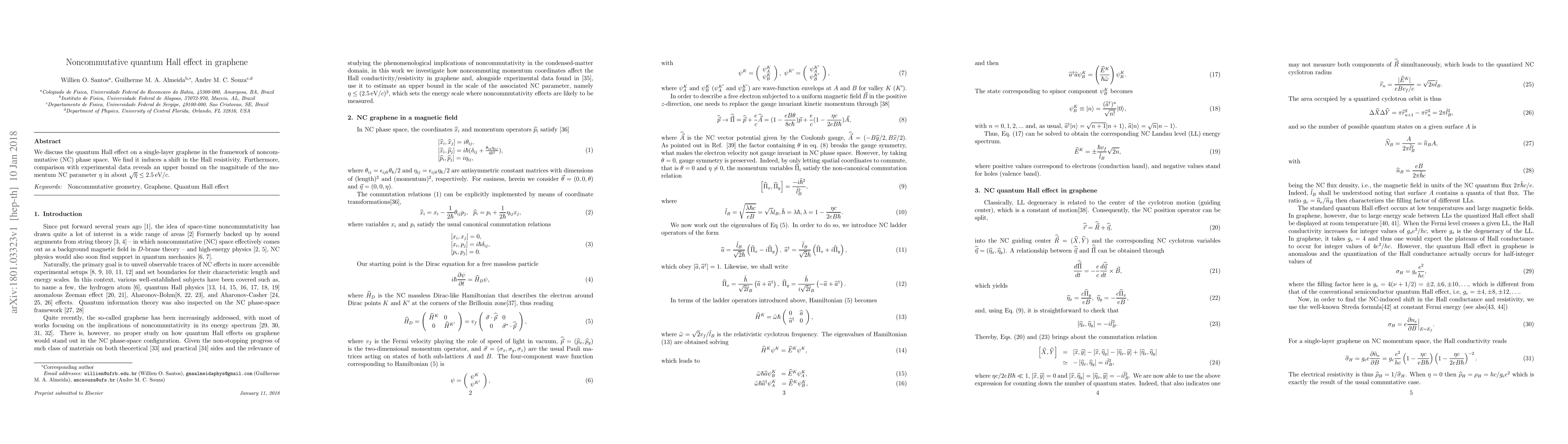 The research investigates the quantum Hall effect in graphene within a noncommutative phase space framework, revealing a shift in Hall resistivity and establishing an upper bound on the momentum noncommutativity parameter $\eta$ of approximately $\sqrt{\eta}\leq 2.5 \, \mathrm{eV}/c$ based on experimental data.
