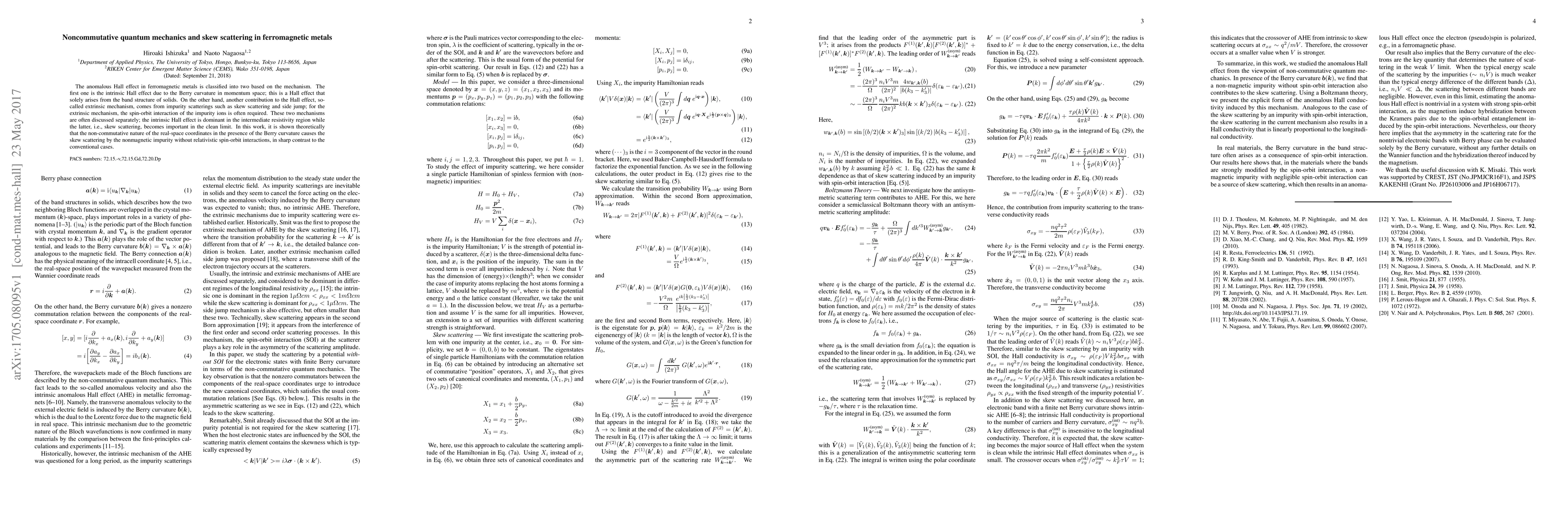 The anomalous Hall effect in ferromagnetic metals is classified into two based on the mechanism. The first one is the intrinsic Hall effect due to the Berry curvature in momentum space; this is a Hall effect that solely arises from the band structure of solids. On the other hand, another contribution to the Hall effect, so-called extrinsic mechanism, comes from impurity scatterings such as skew scattering and side jump; for the extrinsic mechanism, the spin-orbit interaction of the impurity ions is often required. These two mechanisms are often discussed separately; the intrinsic Hall effect is dominant in the intermediate resistivity region while the latter, i.e., skew scattering, becomes important in the clean limit. In this work, it is shown theoretically that the non-commutative nature of the real-space coordinates in the presence of the Berry curvature causes the skew scattering by the nonmagnetic impurity without relativistic spin-orbit interactions, in sharp contrast to the conventional cases.