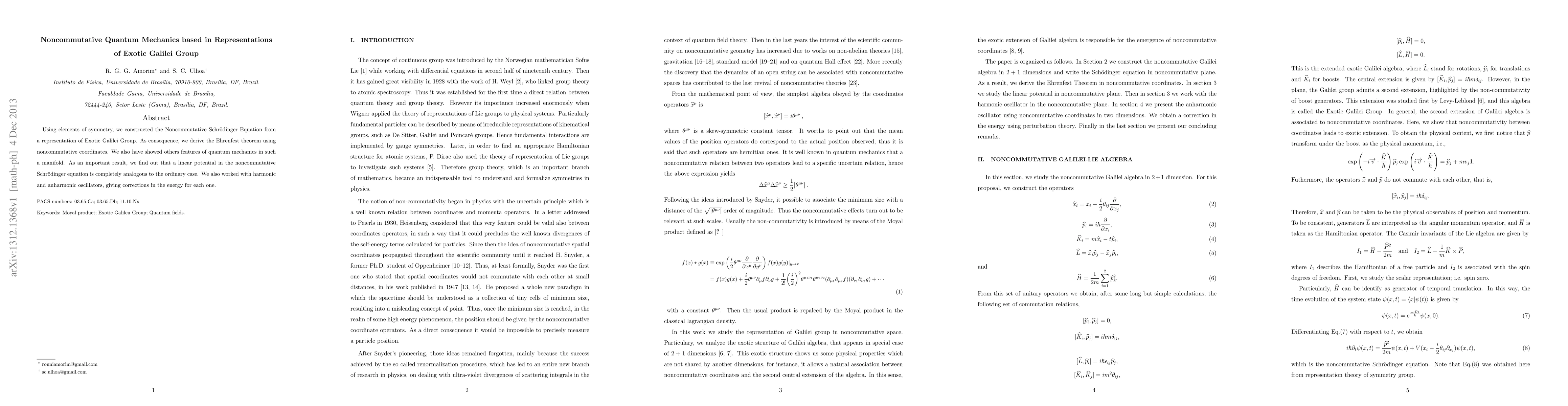 Using elements of symmetry, we constructed the Noncommutative Schr\"odinger Equation from a representation of Exotic Galilei Group. As consequence, we derive the Ehrenfest theorem using noncommutative coordinates. We also have showed others features of quantum mechanics in such a manifold. As an important result, we find out that a linear potential in the noncommutative Schr\"odinger equation is completely analogous to the ordinary case. We also worked with harmonic and anharmonic oscillators, giving corrections in the energy for each one.