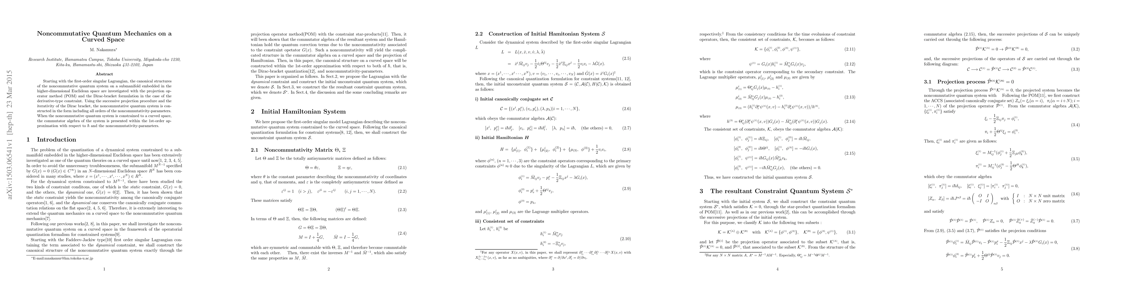 This paper investigates the canonical structures of a noncommutative quantum system on a curved submanifold using the projection operator method and Dirac-bracket formulation. It constructs the system to include all orders of noncommutativity parameters and presents the commutator algebra within a 1st-order approximation for curved space constraints.