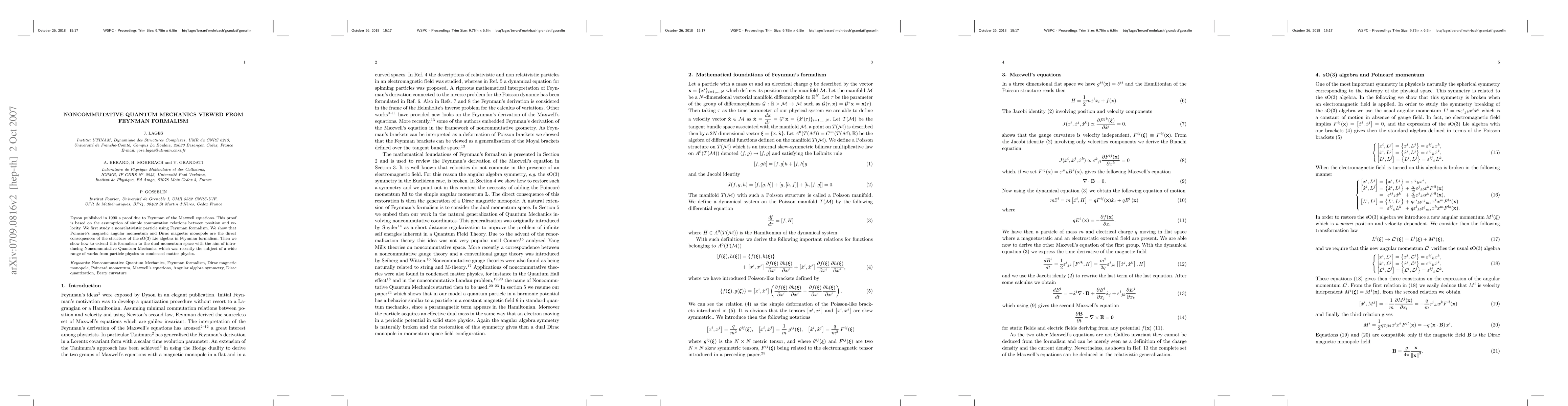 Dyson published in 1990 a proof due to Feynman of the Maxwell equations. This proof is based on the assumption of simple commutation relations between position and velocity. We first study a nonrelativistic particle using Feynman formalism. We show that Poincar\'{e}'s magnetic angular momentum and Dirac magnetic monopole are the direct consequences of the structure of the sO(3) Lie algebra in Feynman formalism. Then we show how to extend this formalism to the dual momentum space with the aim of introducing Noncommutative Quantum Mechanics which was recently the subject of a wide range of works from particle physics to condensed matter physics.