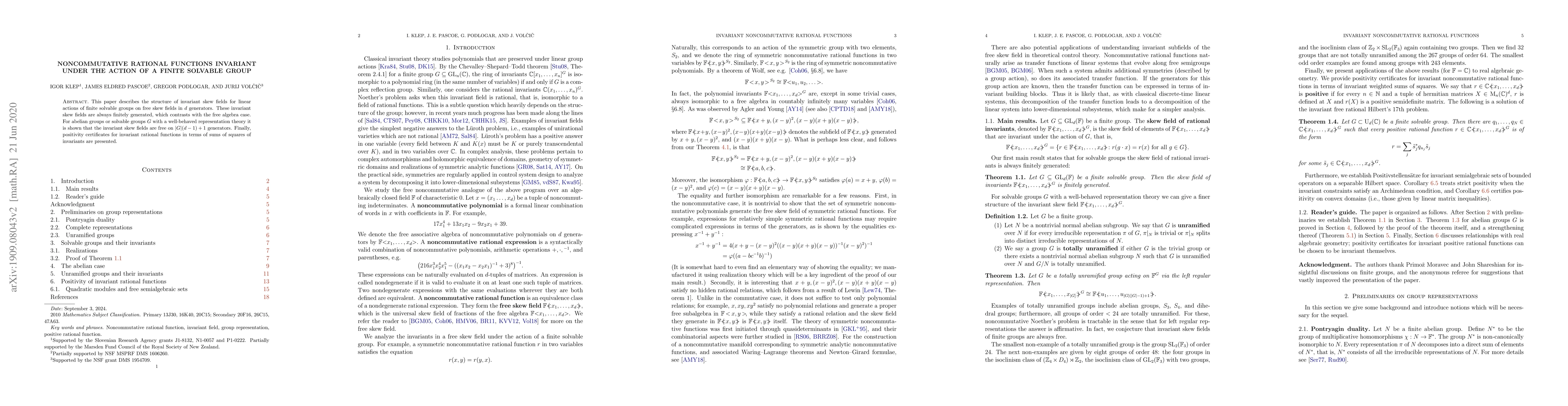 This paper describes the structure of invariant skew fields for linear actions of finite solvable groups on free skew fields in $d$ generators. These invariant skew fields are always finitely generated, which contrasts with the free algebra case. For abelian groups or solvable groups $G$ with a well-behaved representation theory it is shown that the invariant skew fields are free on $|G|(d-1)+1$ generators. Finally, positivity certificates for invariant rational functions in terms of sums of squares of invariants are presented.
