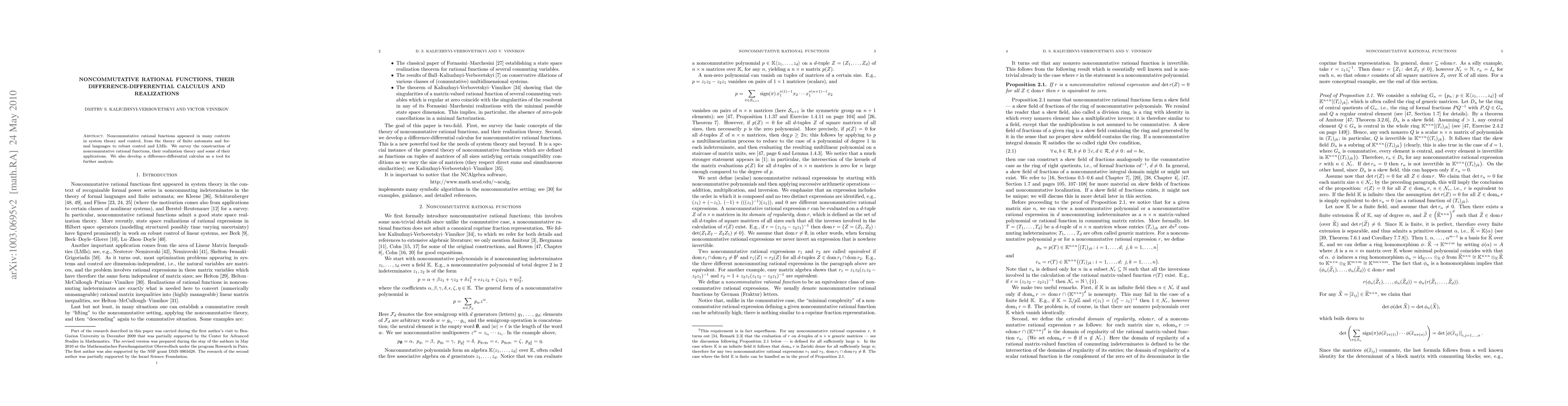 Summary: This paper surveys noncommutative rational functions in system theory, exploring their construction, realization theory, and applications. It also introduces a novel difference-differential calculus to facilitate further analysis.