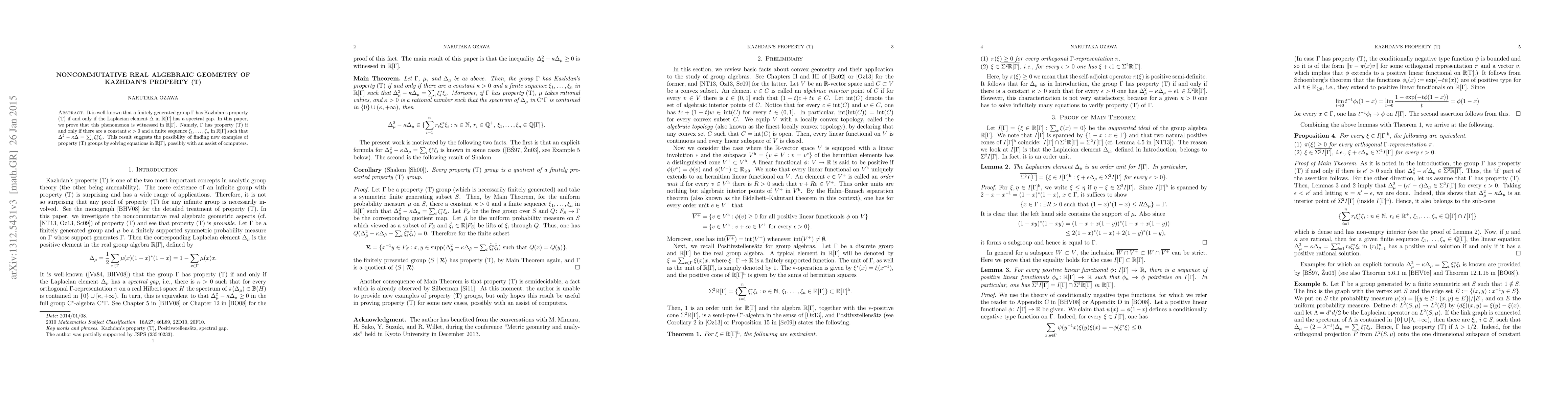 It is well-known that a finitely generated group $\Gamma$ has Kazhdan's property (T) if and only if the Laplacian element $\Delta$ in ${\mathbb R}[\Gamma]$ has a spectral gap. In this paper, we prove that this phenomenon is witnessed in ${\mathbb R}[\Gamma]$. Namely, $\Gamma$ has property (T) if and only if there are a constant $\kappa>0$ and a finite sequence $\xi_1,...,\xi_n$ in ${\mathbb R}[\Gamma]$ such that $\Delta^2-\kappa\Delta = \sum_i \xi_i^*\xi_i$. This result suggests the possibility of finding new examples of property (T) groups by solving equations in ${\mathbb R}[\Gamma]$, possibly with an assist of computers.