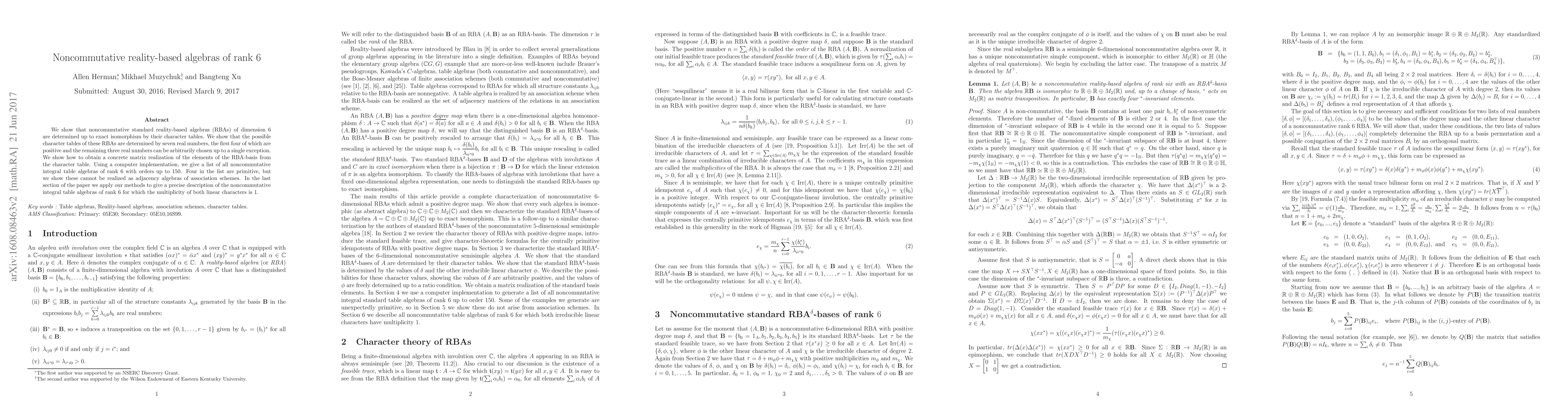 We classify the RBA-bases of $6$-dimensional noncommutative semisimple algebras for which the algebra has a positive degree map. We show that these RBAs are parametrized by seven real numbers, the first four of which are positive and the remaining three arbitrary. Our classification gives formulas for their standard bases and structure constants. Using these we give a list of all noncommutative integral table algebras of rank 6 with order up to 150. Four in the list are primitive, but we show these cannot be realized as adjacency algebras of association schemes. In the last section of the paper we apply our methods to give a precise description of the noncommutative integral table algebras of rank 6 for which the multiplicity of both linear characters is 1.