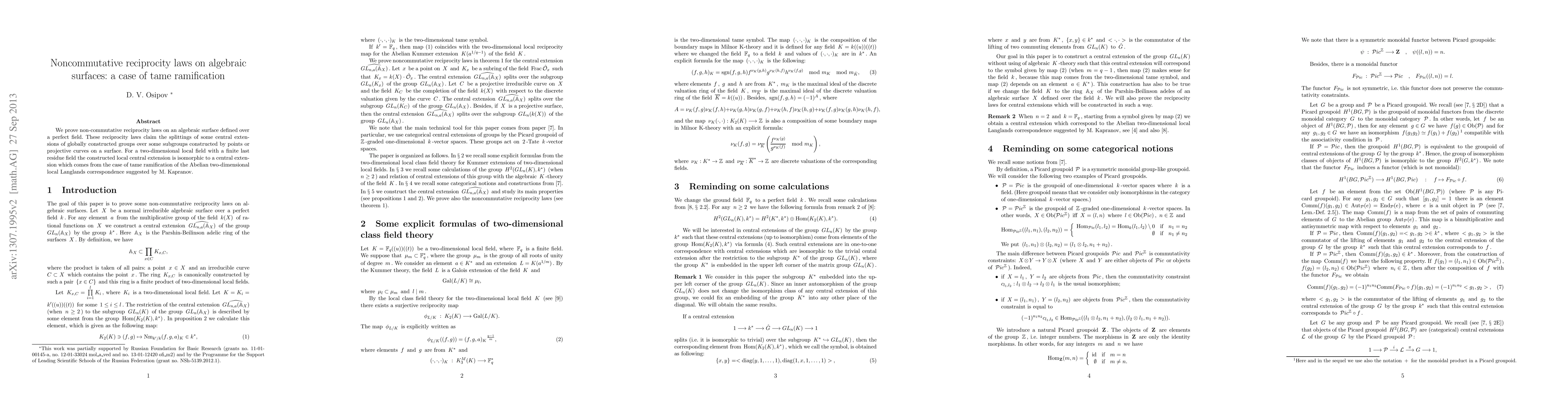 This paper proves non-commutative reciprocity laws on algebraic surfaces over perfect fields, relating the splittings of central extensions to points or curves on the surface. It connects these laws to tame ramification in the context of the Abelian two-dimensional local Langlands correspondence.