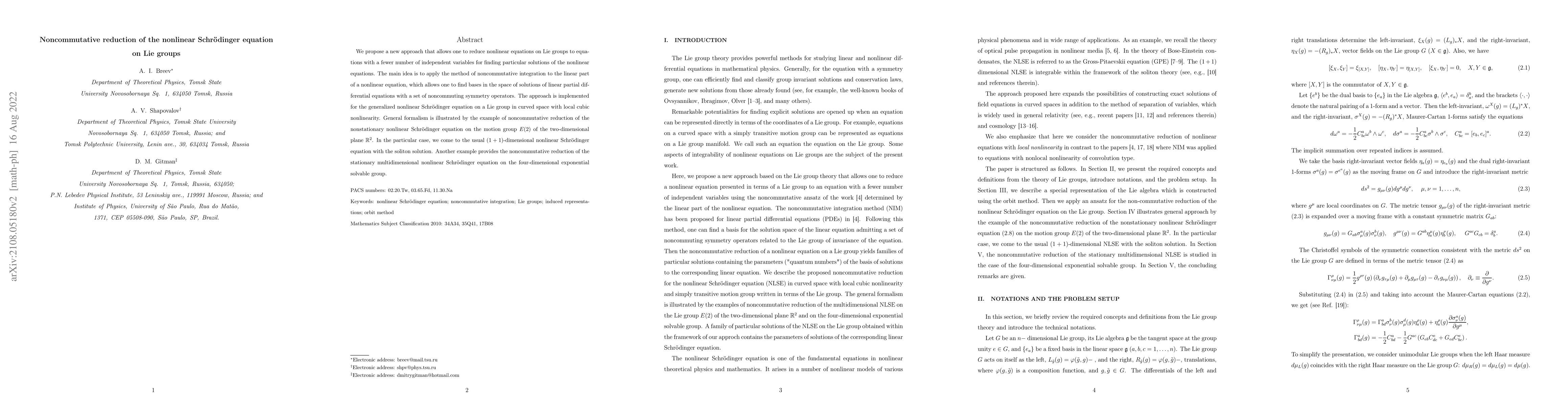 We propose a new approach that allows one to reduce nonlinear equations on Lie groups to equations with a fewer number of independent variables for finding particular solutions of the nonlinear equations. The main idea is to apply the method of noncommutative integration to the linear part of a nonlinear equation, which allows one to find bases in the space of solutions of linear partial differential equations with a set of noncommuting symmetry operators. The approach is implemented for the generalized nonlinear Schr\"{o}dinger equation on a Lie group in curved space with local cubic nonlinearity. General formalism is illustrated by the example of noncommutative reduction of the nonstationary nonlinear Schr\"{o}dinger equation on the motion group $E(2)$ of the two-dimensional plane $\mathbb{R}^{2}$. In the particular case, we come to the usual ($1+1$) dimensional nonlinear Schr\"{o}dinger equation with the soliton solution. Another example provides the noncommutative reduction of the stationary multidimensional nonlinear Schr\"{o}dinger equation on the four-dimensional exponential solvable group.