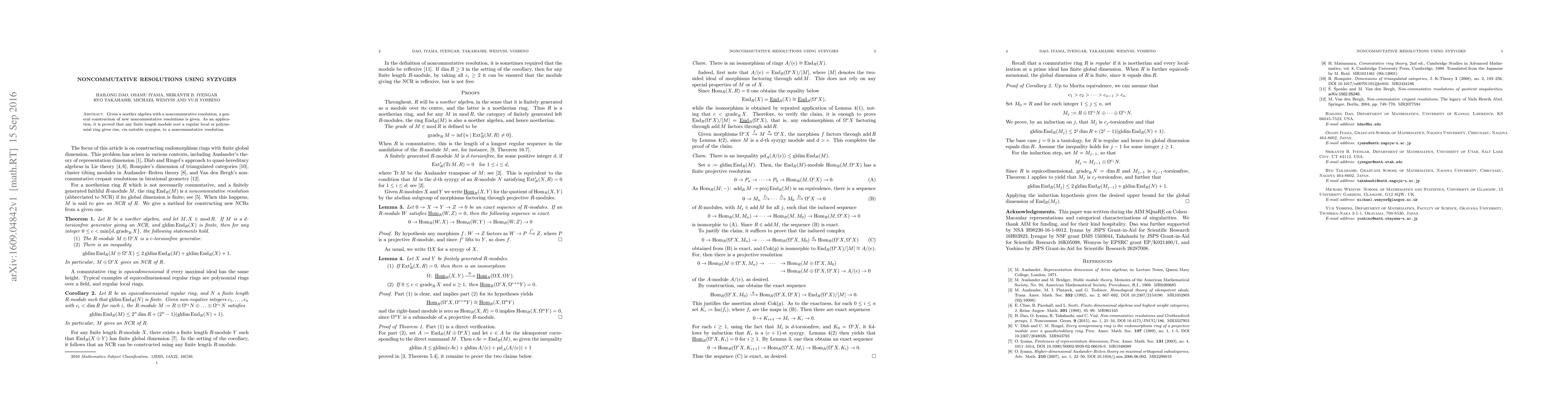 Summary: The paper presents a method for constructing new noncommutative resolutions using syzygies for Noetherian algebras. It demonstrates that finite length modules over regular local or polynomial rings can generate noncommutative resolutions through appropriate syzygies.