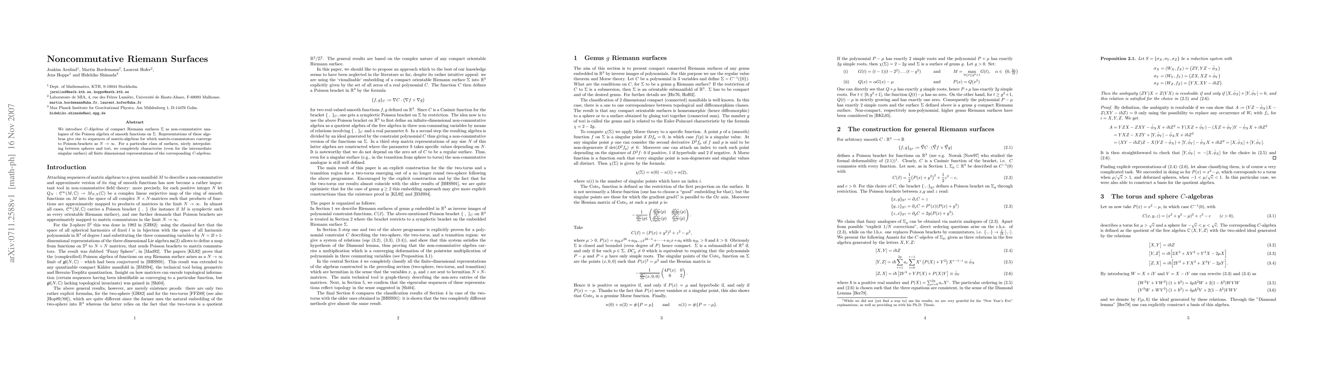 This paper introduces C-Algebras of compact Riemann surfaces as non-commutative analogues of smooth function algebras, showing that matrix-commutators converge to Poisson-brackets in large dimensions. The authors fully characterize finite dimensional representations for a specific class of surfaces, including an intermediate singular case.