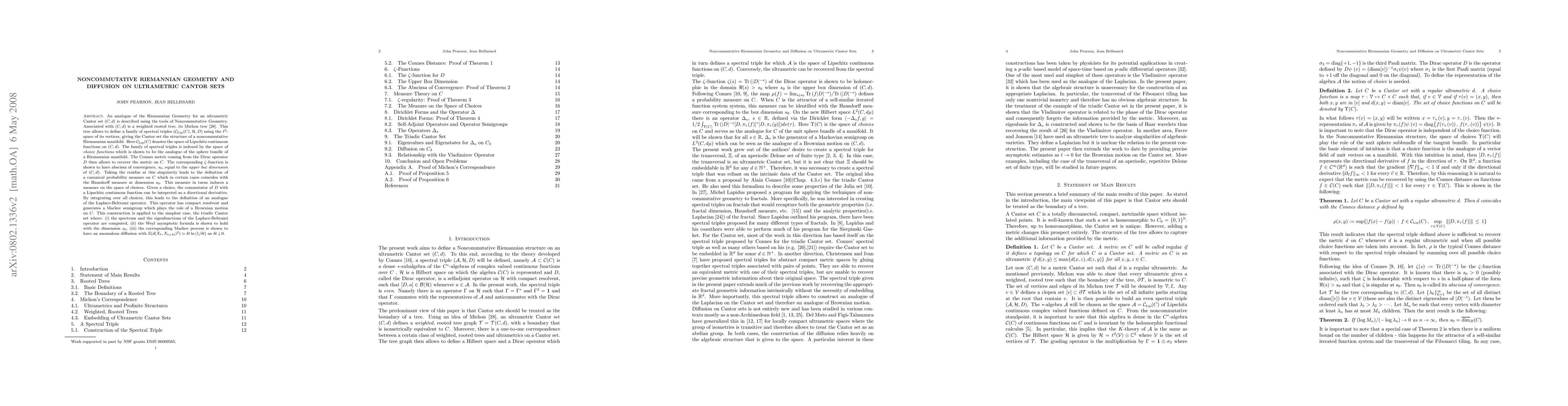 This paper develops a noncommutative geometric framework for an ultrametric Cantor set, defining it as a noncommutative Riemannian manifold via spectral triples. It introduces a canonical probability measure and constructs a Laplace-Beltrami operator generating a Markov semigroup, analogous to Brownian motion, applied to the triadic Cantor set.