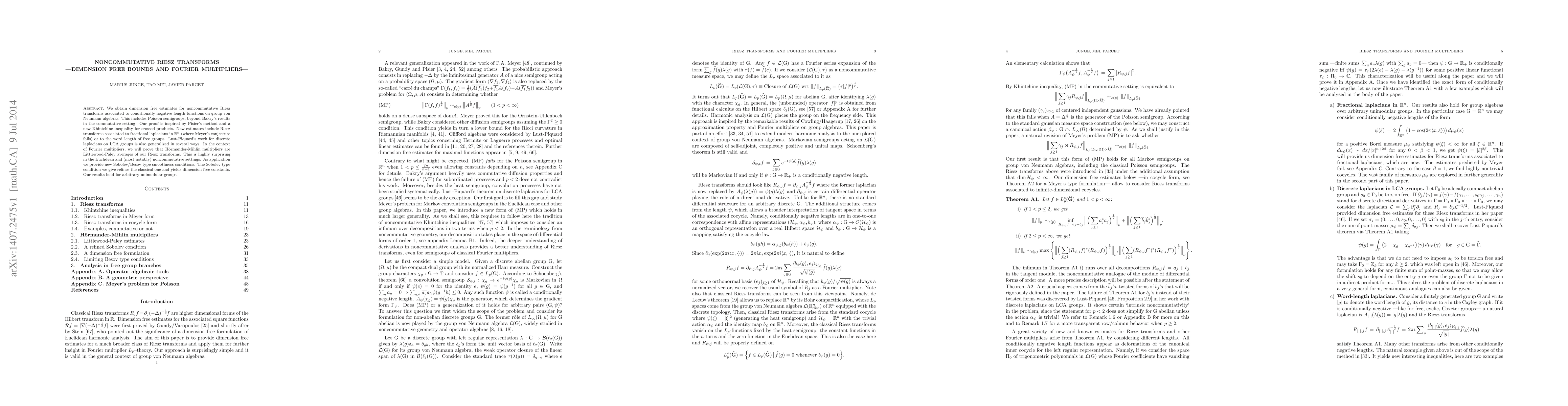 We obtain dimension free estimates for noncommutative Riesz transforms associated to conditionally negative length functions on group von Neumann algebras. This includes Poisson semigroups, beyond Bakry's results in the commutative setting. Our proof is inspired by Pisier's method and a new Khintchine inequality for crossed products. New estimates include Riesz transforms associated to fractional laplacians in $\mathbb{R}^n$ (where Meyer's conjecture fails) or to the word length of free groups. Lust-Piquard's work for discrete laplacians on LCA groups is also generalized in several ways. In the context of Fourier multipliers, we will prove that H\"ormander-Mihlin multipliers are Littlewood-Paley averages of our Riesz transforms. This is highly surprising in the Euclidean and (most notably) noncommutative settings. As application we provide new Sobolev/Besov type smoothness conditions. The Sobolev type condition we give refines the classical one and yields dimension free constants. Our results hold for arbitrary unimodular groups.