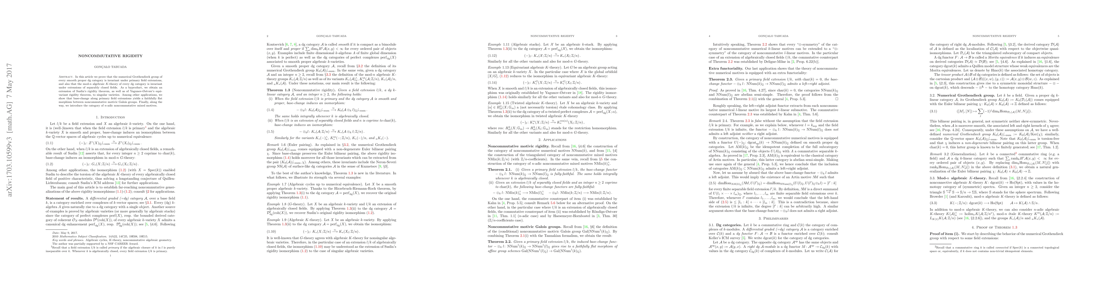In this article we prove that the numerical Grothendieck group of every smooth proper dg category is invariant under primary field extensions, and also that the mod-n algebraic K-theory of every dg category is invariant under extensions of separably closed fields. As a byproduct, we obtain an extension of Suslin's rigidity theorem, as well as of Yagunov-Ostvaer's equivariant rigidity theorem, to singular varieties. Among other applications, we show that base-change along primary field extensions yields a faithfully flat morphism between noncommutative motivic Galois groups. Finally, along the way, we introduce the category of n-adic noncommutative mixed motives.
