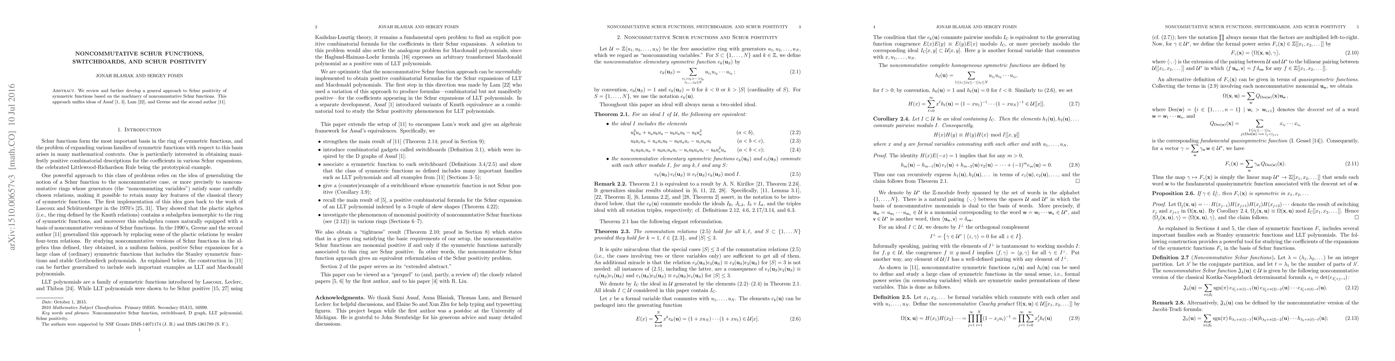 This paper develops noncommutative Schur functions to expand a broader class of symmetric functions and introduces switchboards to provide combinatorial tools for achieving Schur positivity results. It extends prior work and provides new formulas for LLT polynomials' Schur expansions.