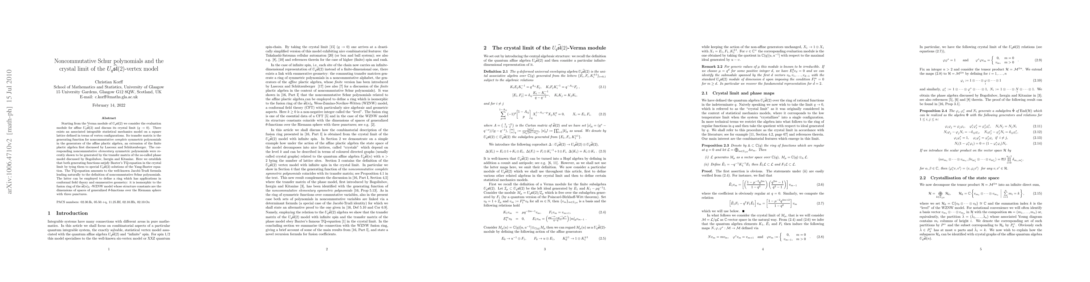 This paper connects noncommutative Schur polynomials to the crystal limit of the U_q sl(2)-vertex model, demonstrating that both generating functions for noncommutative symmetric polynomials satisfy Baxter's TQ-equation. This leads to applications in conformal field theory and enumerative geometry through the fusion ring of the sl(n)_k -WZNW model.